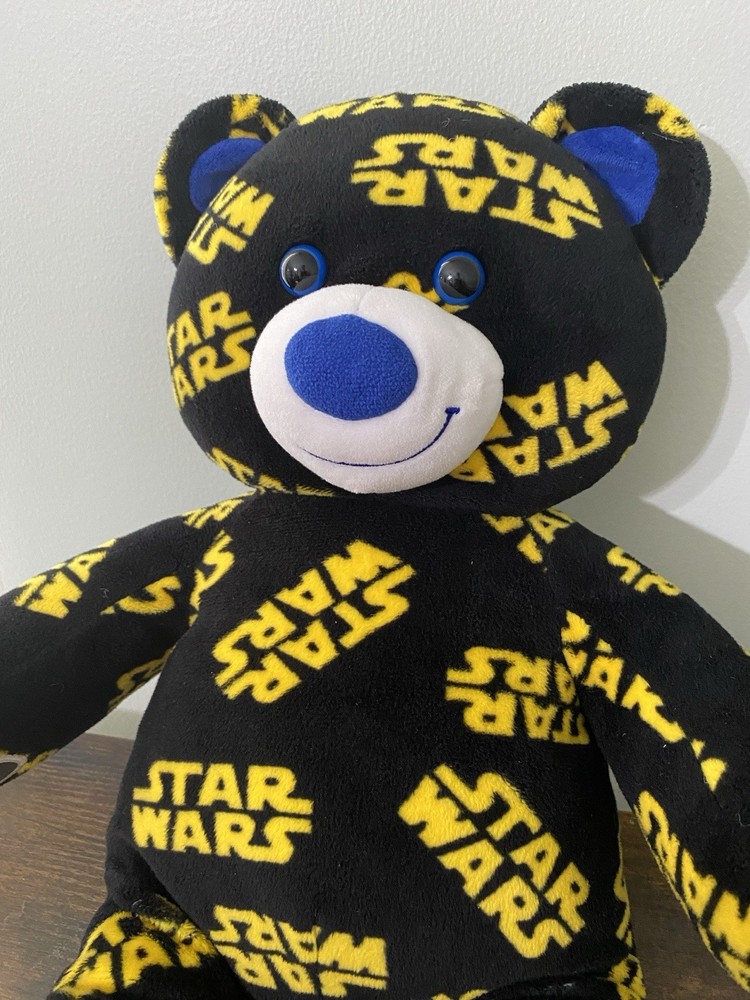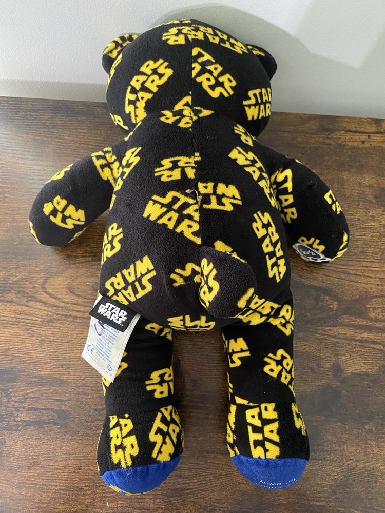 RARE LIMITED Build a Bear Star Wars Themed Teddy 16in. Stuffed Plush Black with Yellow Star Wars print and B.A.B. Branded paw print logo. See pictures for initials on tag