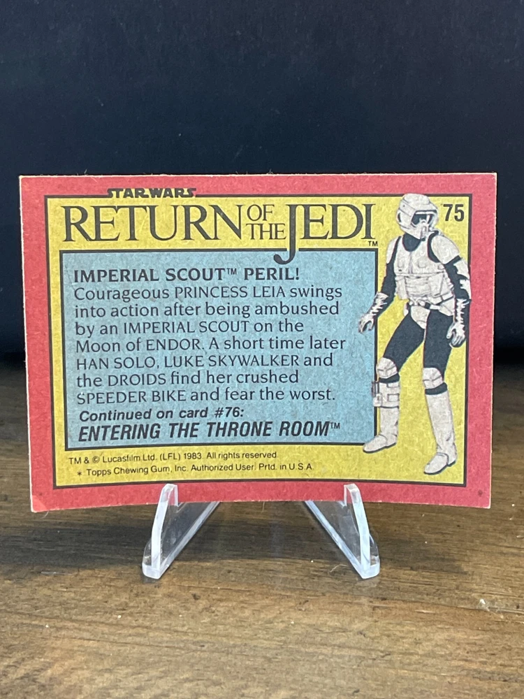The product is a vintage Star Wars trading card from 1983 featuring Leia Organa in the "Imperial Scout Peril" series by Topps. The card is part of the Star Wars franchise and depicts a scene involving the Imperial Scout character. This collectible card is a single non-sport trading card from the Star Wars set.
