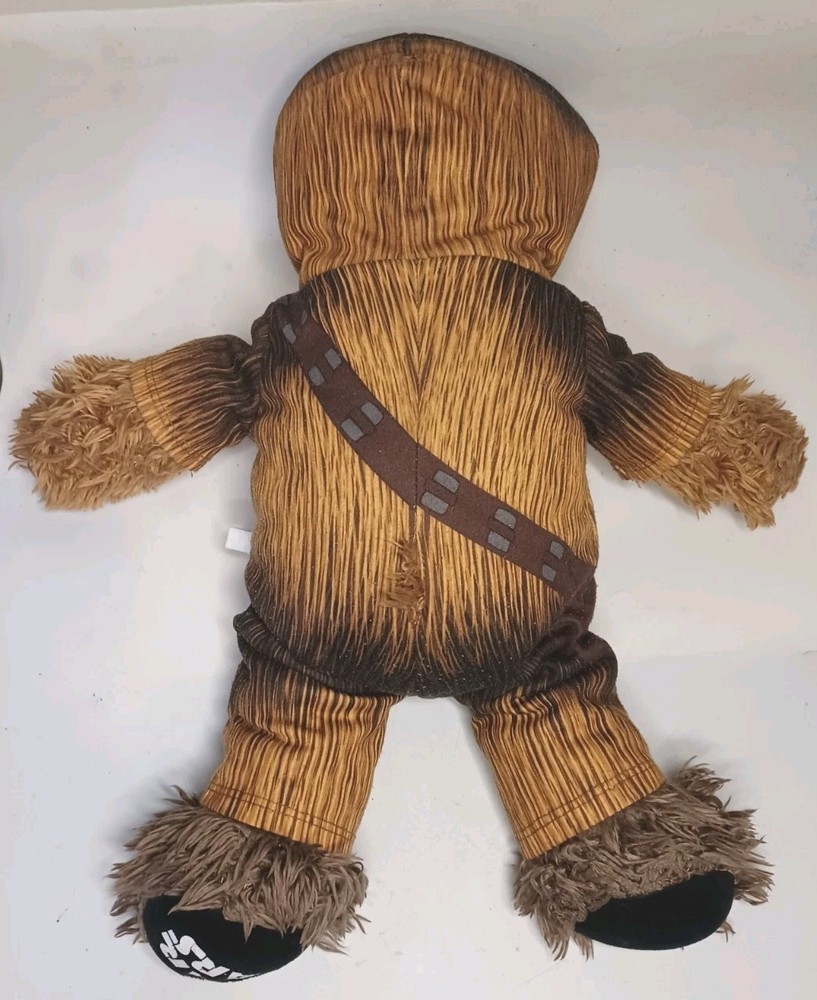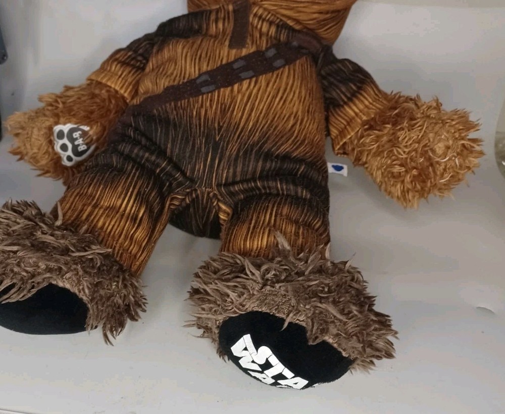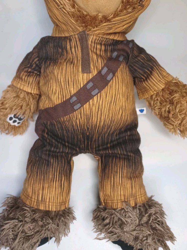 Star Wars fans can add a unique piece to their collection with this 17-inch used loose item with wear as shown, Chewbacca plush toy from Build-A-Bear Workshop. The brown bear is made of high-quality plush material and comes with clothing items to dress it up. This rare and retired collectible is perfect for display or play, and is sure to be a hit with any Star Wars enthusiast. The bear is part of the Star Wars collection and features intricate details such as the iconic Star Wars logo on its paw. It is a one-of-a-kind item that is sure to be a conversation starter. Add this Chewy Chewbacca plush toy to your collection today!