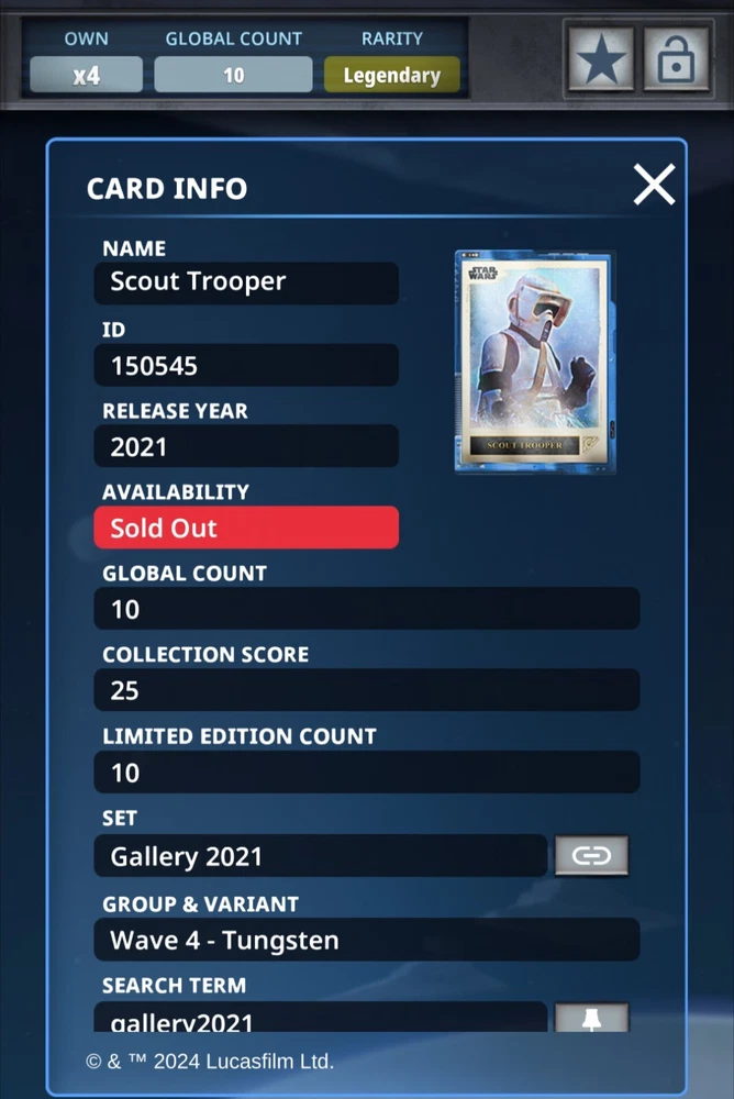 Topps Star Wars Card Trader 2021 Gallery Wave4 Legendary Gilded Tungsten Scout Trooper 10cc Limited Edition This is a digital card. Please include Swct IGN with purchase. We do not sell to new accounts or accounts with poor trade ratings.