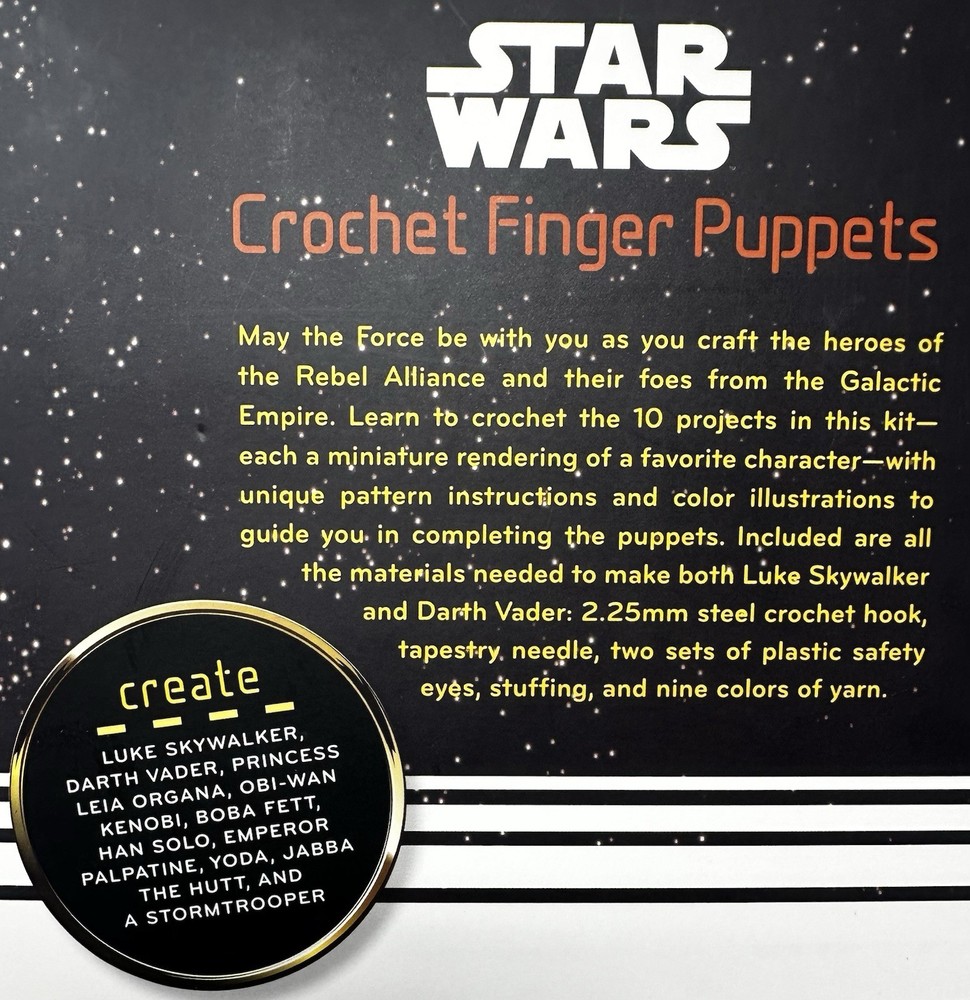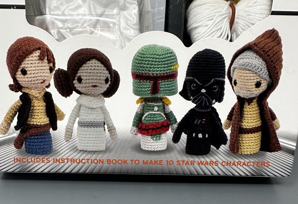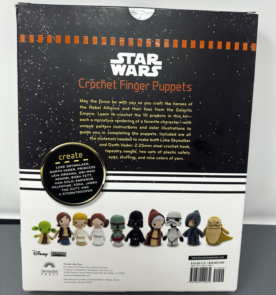 NEW Disney Star Wars crochet finger puppet kit that includes instructions for making 10 Star Wars characters, including Luke Skywalker and Darth Vader. This kit falls under the Science Fiction genre and is part of the Star Wars franchise. Perfect for fans of the iconic sci-fi series.