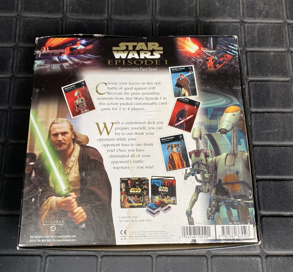 The "Star Wars Episode 1 Card Game 4 Deck Starter Pack" is an open box set for the Star Wars Episode I Collectible Card Game (CCG) by Decipher. This starter pack includes four decks of cards featuring characters and elements from the Star Wars franchise, specifically from Episode I. The game is in English and is designed for fans of the Star Wars universe to engage in strategic gameplay within the war genre. Perfect for collectors and fans looking to expand their Star Wars CCG collection with a variety of characters and cards from the Episode I series.