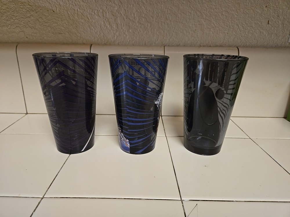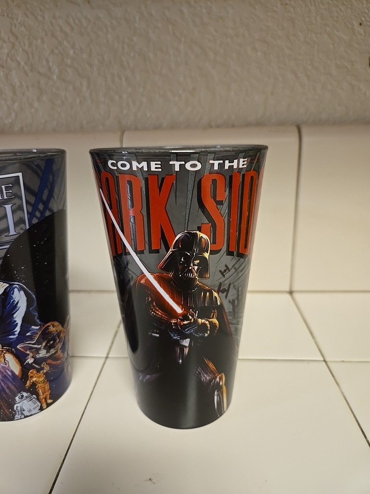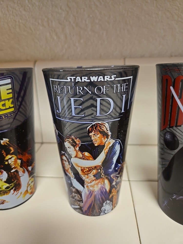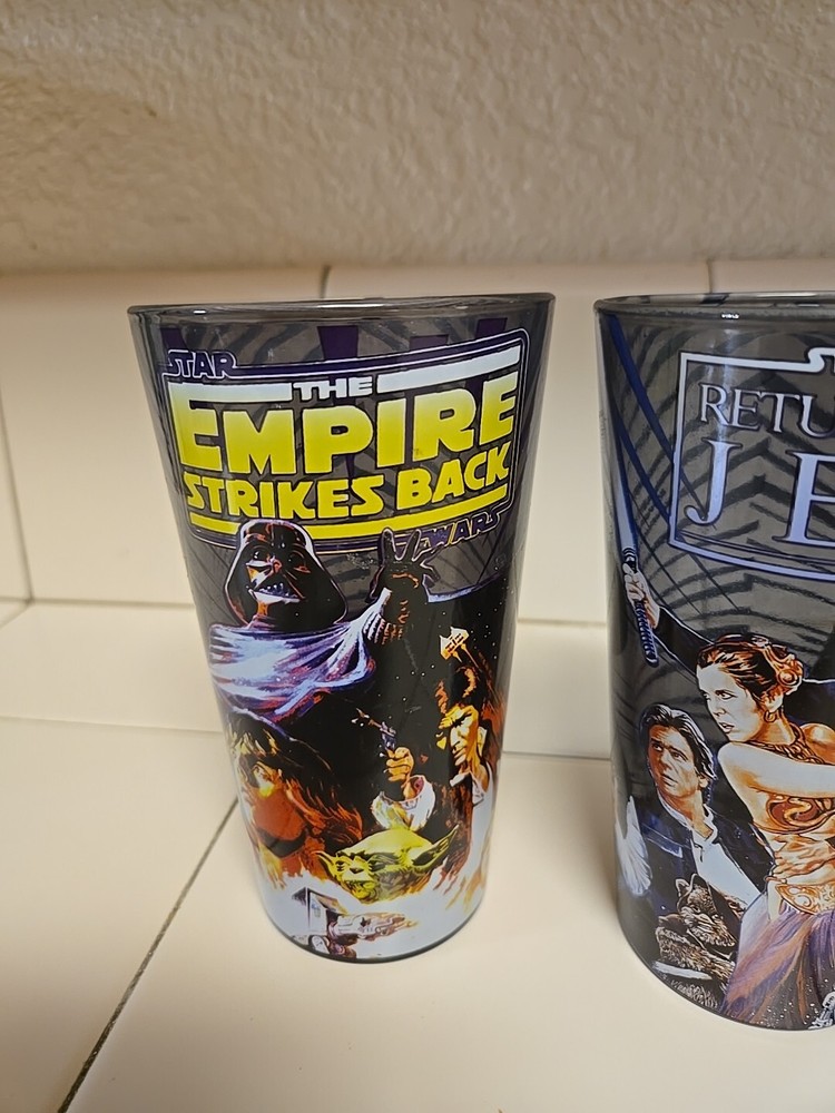The product is a set of Star Wars glass cups featuring designs from "Return of the Jedi" and "The Empire Strikes Back," and Come to the Dark Side. Manufactured in China by Lucasfilm Ltd., the cups are part of the Star Wars franchise and cater to fans of science fiction and horror genres. These non-vintage collectibles are themed around the character Darth Vader.