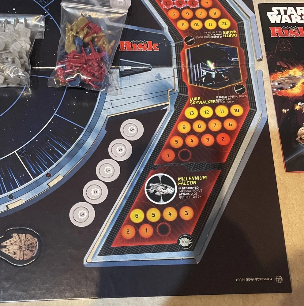 The "Star Wars Hasbro Risk Board Game" is a 2014 reimagined version of the classic game Risk, with a theme based on the Star Wars franchise. It is designed for 4 players and has a game board layout that reflects the galactic landscape of the Star Wars universe. The game includes elements of strategy and conflict as players battle for control over different regions, making it an engaging and competitive experience for Star Wars fans and board game enthusiasts alike. The board game box has some visible signs of wear but the game is complete with all the pieces and cards. Some pieces of the game board haven’t even been punched out yet. Please see ALL photos for a better idea on condition, any measurements, or details to the board game.
