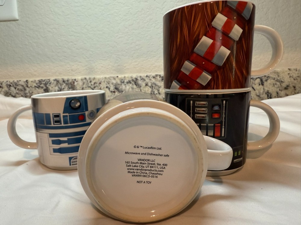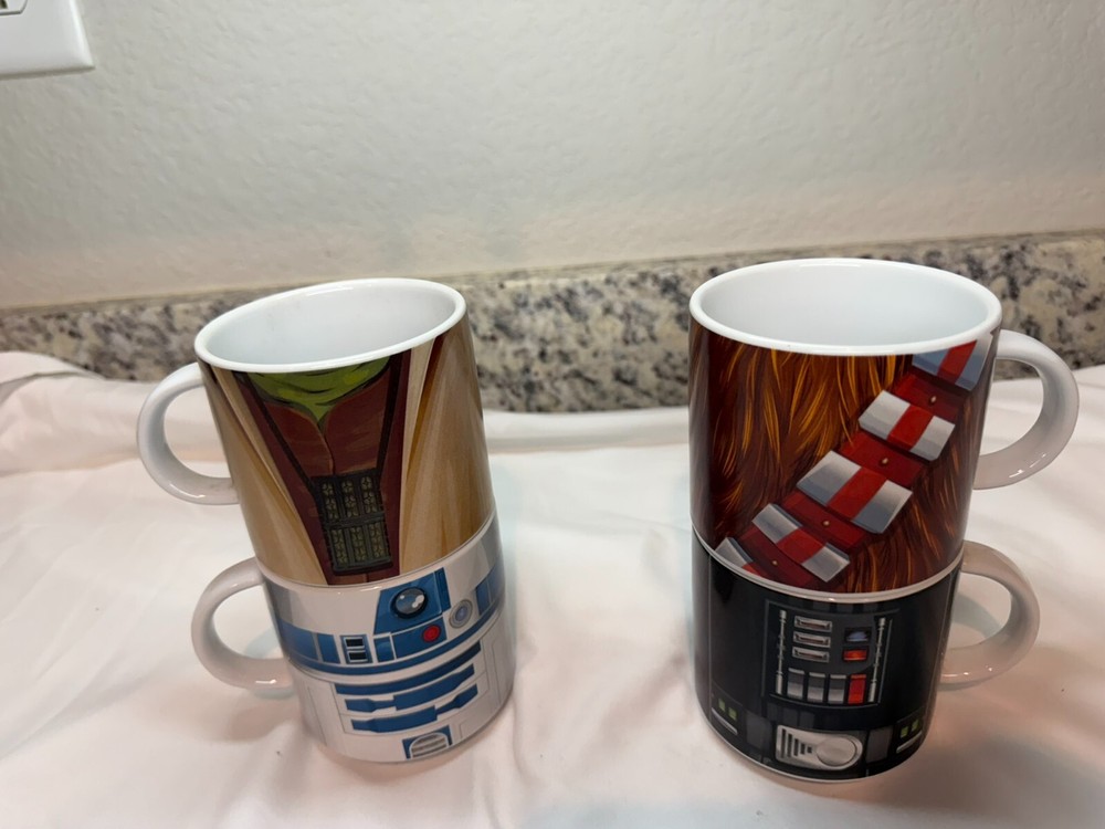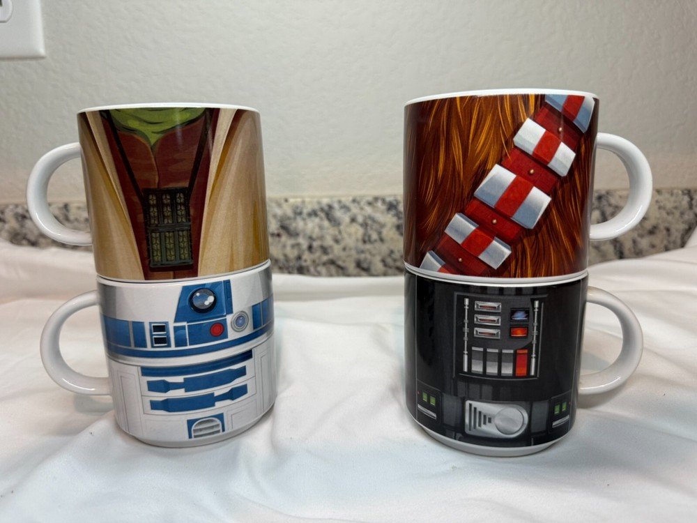 4-pack of ceramic mugs features awesome designs inspired by the Star Wars universe. Each mug has a unique look, and they all stack neatly on top of each other and perfect for saving space in your kitchen or showing off on a shelf.Set of 4 ceramic mugsEach mug has a different Star Wars designStackable! and saves space and looks great displayedMicrowave and dishwasher safe