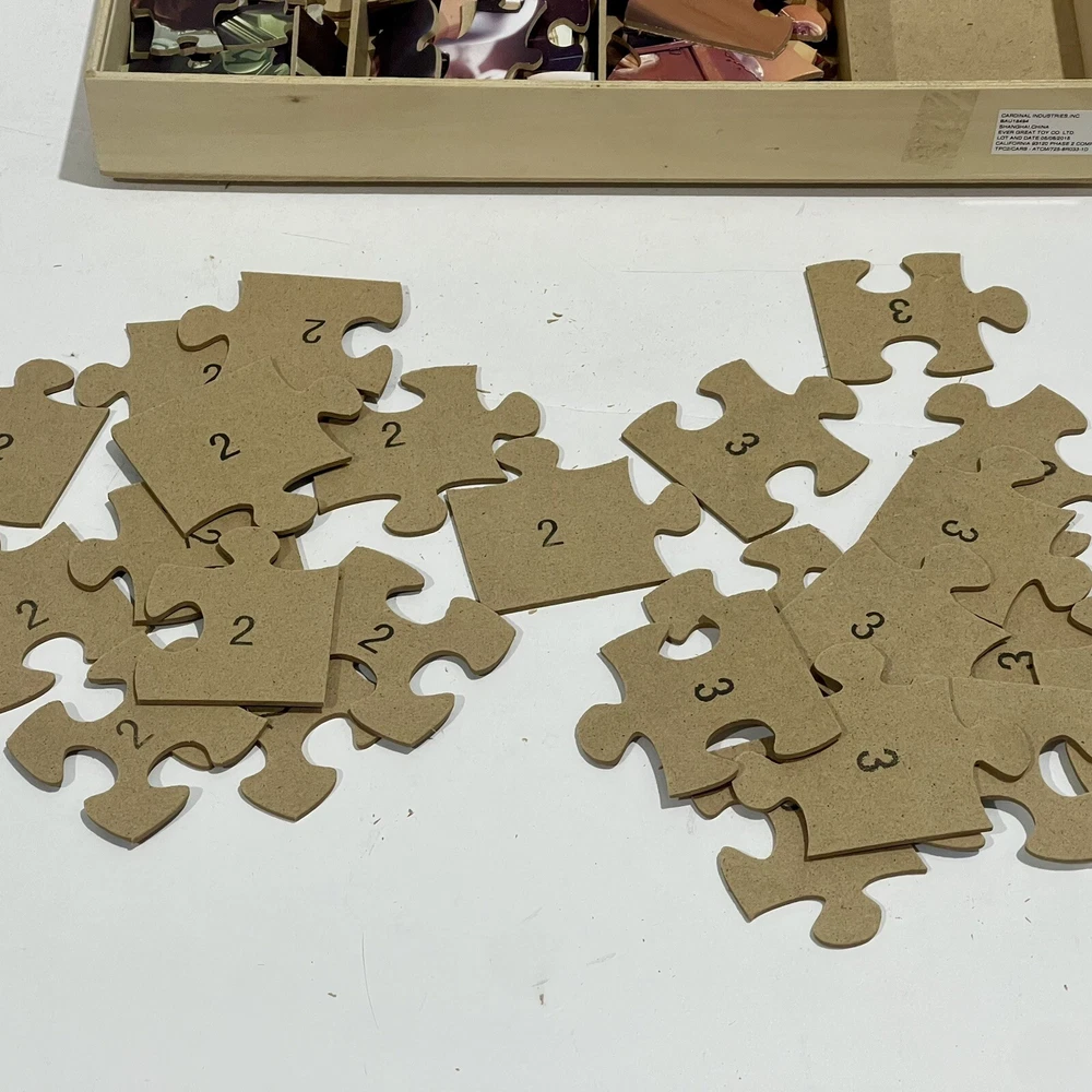 Complete set, contains 7 wooden puzzles. Great condition! Puzzle pieces are numbered by set so they are easy to sort. 1-13.4 inches x 8.3 inches 2-13.4 inches x 4.1 inches 2- 6.6 inches x 8.3 inches 1-8.7 inches x 8.3 inches 1-4.6 inches x 8.3 inches