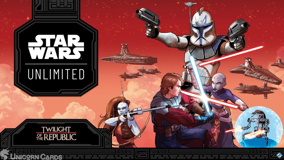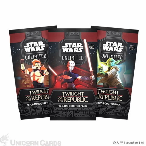Star Wars: Unlimited - Twilight of the Republic Booster Display Box (24 Packs) : IN STOCK Enter a galaxy of endless possibilities in Star Wars™: Unlimited! In this fast-paced, easy-to-lean trading card game, you and your opponent face off in exciting head-to-head battles full of iconic Star Wars characters. In this booster pack display for the game's third set, Twilight of the Republic, you'll find 24 individually wrapped booster packs. Each pack contains 9 common cards, 3 uncommon cards, 1 rare or legendary card, 1 leader, 1 base/token, and 1 foil card. The Twilight of the Republic set highlights the military conflicts between the Galactic Republic and the Confederacy of Independent Systems, featuring the heroes and villains that fought each other throughout the Clone Wars.