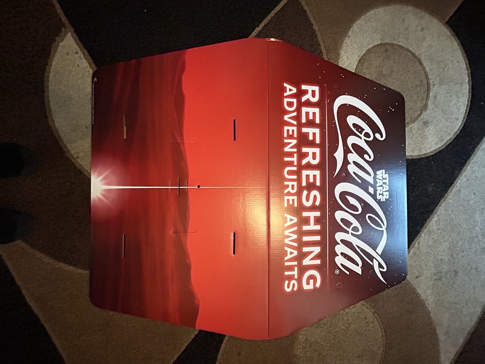 SIZE!!!!! Back Piece L: 46 inches W: 43 inches Mini Cans L: 19.5 inches W: 28.5 inches This is the full set cardboard signage of the collaboration between Coca Cola and Star Wars, Project Solo. Great for collectors and avid fans, this is a LIMITED TIME PROMO that will be concluding very soon. These pieces will be extremely hard to come across in the next couple months. The mini cans have flaps on the backside, that allow the cans to be inserted into the opening of the giant back piece, giving a 3D affect. Hang the huge piece on a wall, and the mini cans will perfectly fit and hang onto the back piece. The back flaps (top and bottom) of the cans need to be folded down, to insert into the slot, so it opens up and the back flap catches into place. Refer to photos for a better understanding! The quality of this piece is pretty good, I’d give it a solid 8/10. The giant back piece has been folded in half (due to being torn down from the stores) and the backsides has slight tape tear marks, from where the tape/adhesive was sticking. Over looking that, this is an incredible collector piece, that will not be made again. The back piece is supposed to have LEDS in the wording, but this certain signage one didn’t have the working LEDS. Price adjusted due to the LEDs not working.