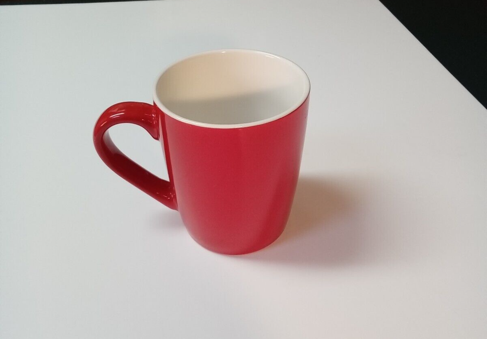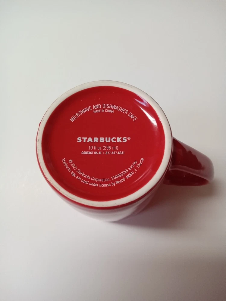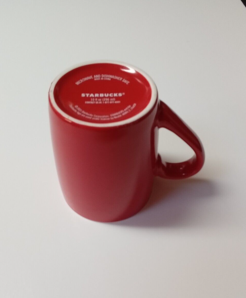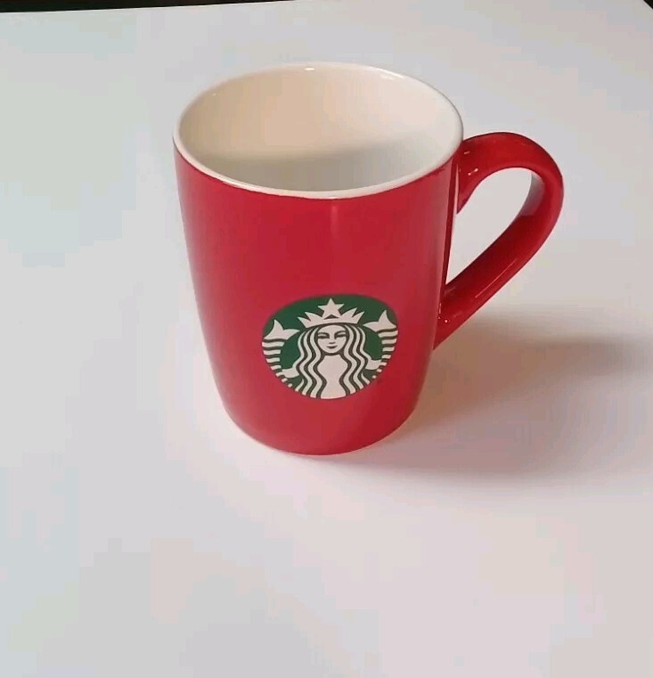 This is a Starbucks 2021 10 oz red coffee cup mug featuring the iconic green mermaid logo and white inside the ceramic cup. This original advertising piece from China is designed with a classic Starbucks theme of coffee and tea, perfect for collectors or fans of the brand. The red color and unique design make it a standout piece for coffee and tea enthusiasts looking to add to their collection. The cup is in used condition with no chips or cracks. See photos.