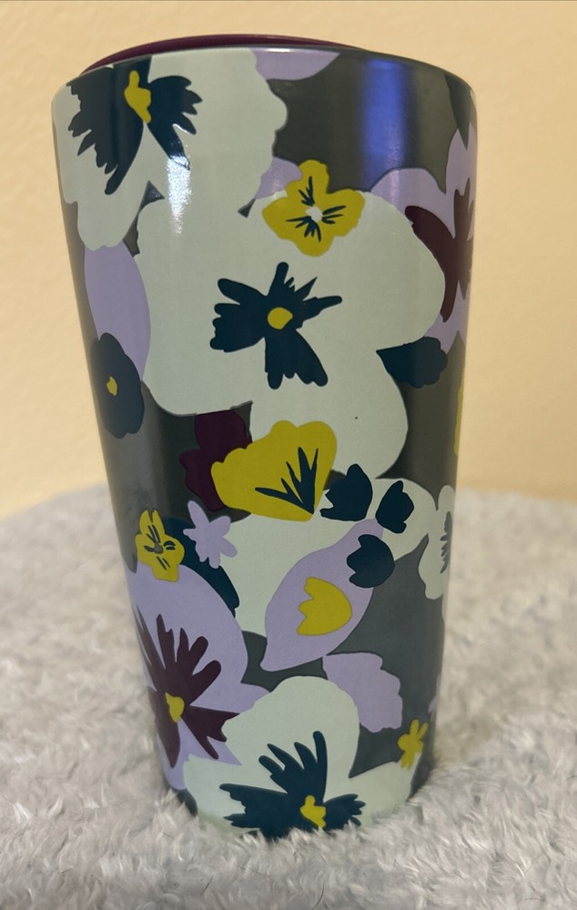 This stunning Starbucks travel mug features a beautiful lilac and green pansy design, perfect for coffee and tea lovers alike. With a 12oz capacity, it's great for on-the-go use, and its double wall ceramic construction ensures your beverage stays hot or cold for longer. This original 2020 creation is a must-have for any Starbucks collector or fan, and is made in China with careful attention to detail. The California Prop 65 Warning does not apply to this item.