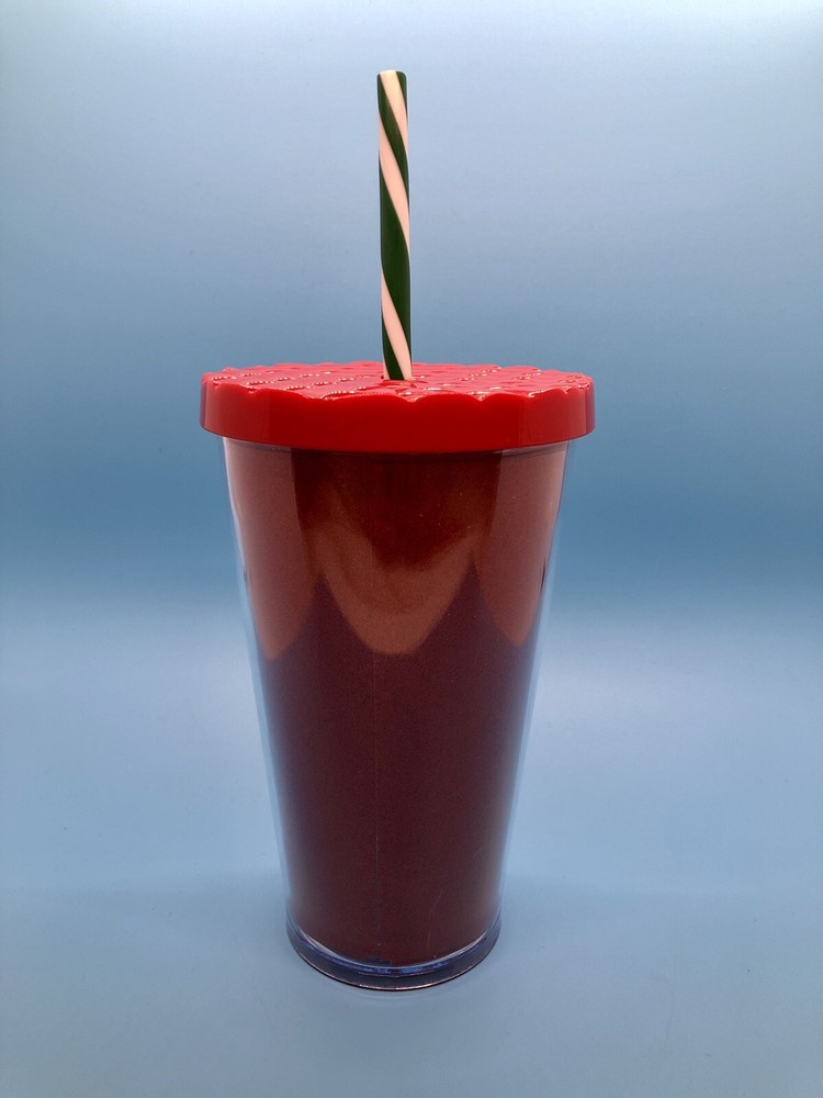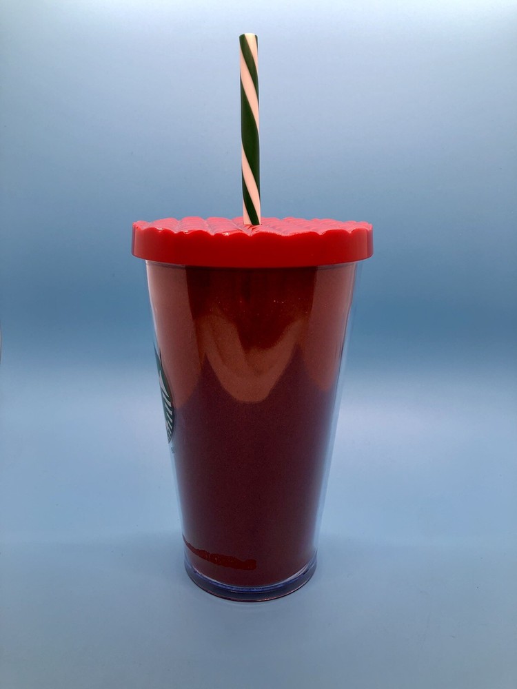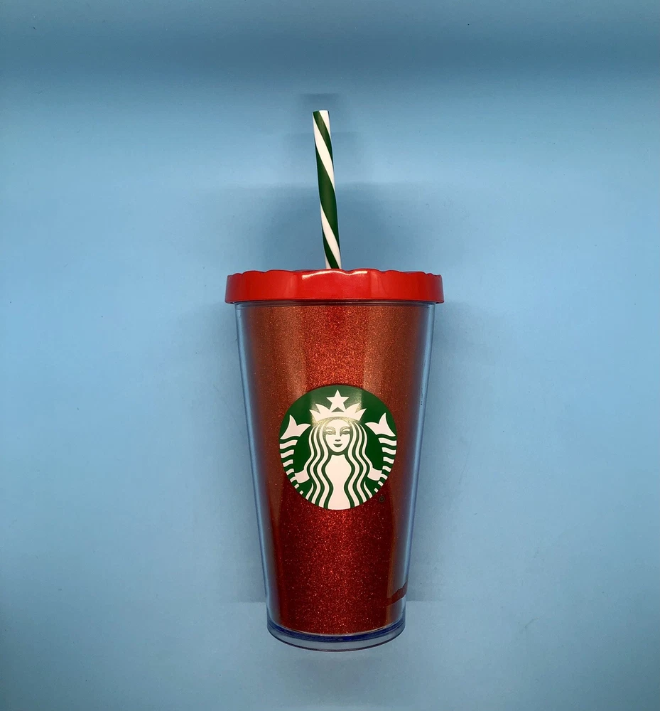 Starbucks 16 oz Ruby Red Sparkly Glitter Holiday Tumbler Waffle Top Green Straw Minor Imperfections Seen In Last Two Photos Please refer to the pictures for the quality and condition of this item, zooming in as necessary. X/4/X/X