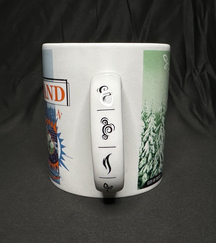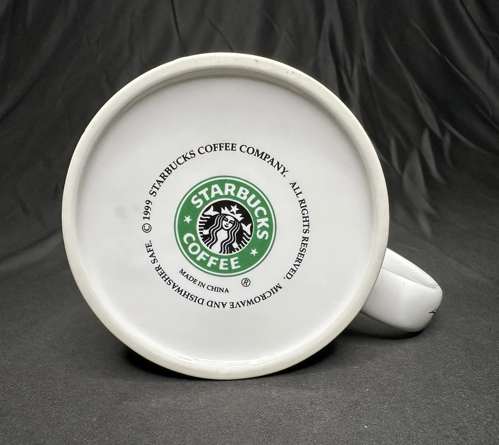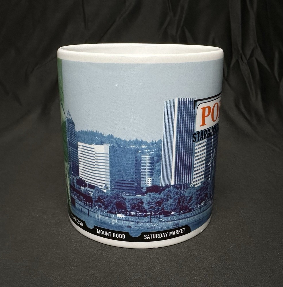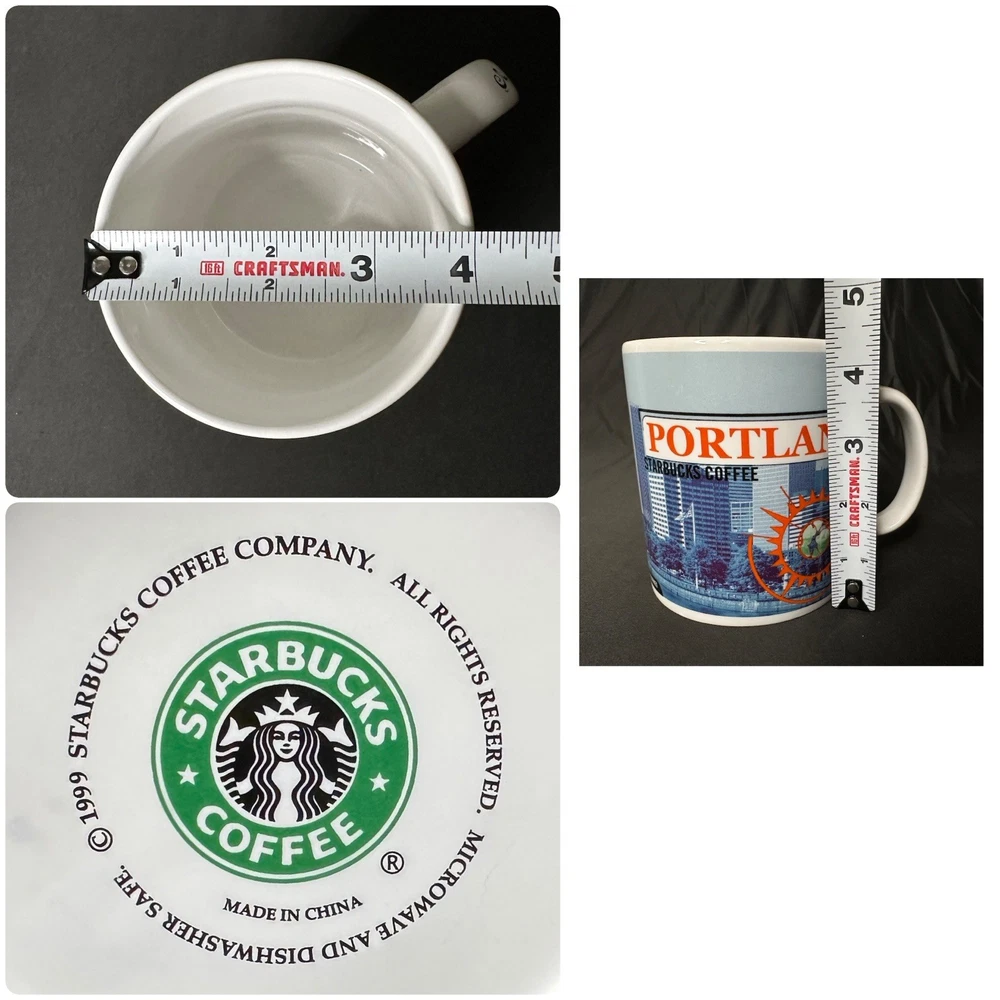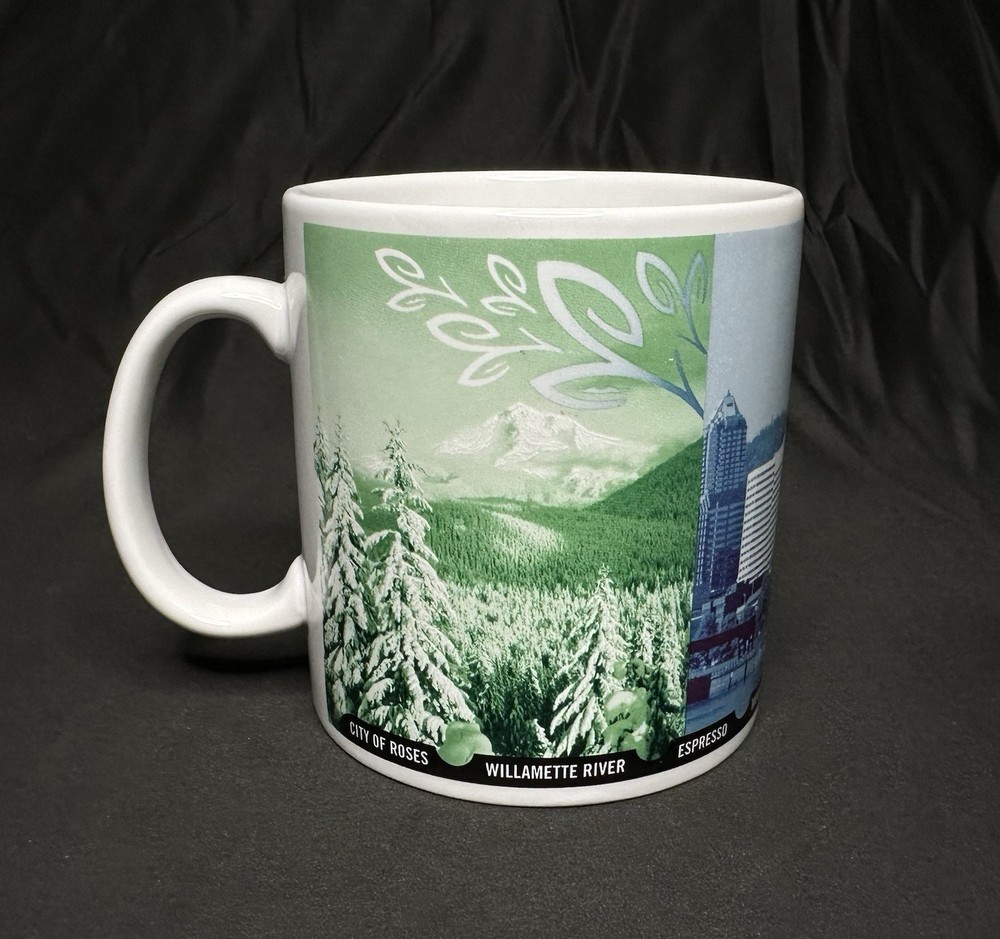 Starbucks Coffee Portland 1999 Large Ceramic Mug. Approximately 4 3/8” tall and 4” wide across top rim. Mug has SURFACE WEAR/marks (noticeable in the interior) from use.