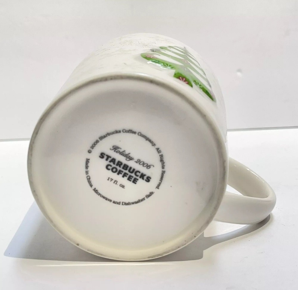 This Starbucks coffee cup mug is a perfect addition to your collection. It features a festive design with 3D Christmas tree snowflakes and a green color that will make you stand out in a crowd. The mug is from the 2006 holiday season and is an original piece, not a reproduction. It has a capacity of 17oz and is made in China. The mug is a Starbucks type of advertising sign and is perfect for coffee and tea enthusiasts. Please see pictures for details. What you see is what you get Returns accepted in same condition as received. No Exceptions Handling We will ship all orders within 1 business day of payment. Delivery US We Do Not Ship Outside of the Continental US. International Delivery We ship to international customers only via the eBay Global Shipping eBay international Program, please see the price quote in the listing. Return Policy Please see our return policy. Feedback We take our reputation seriously, we buy and sell online, so we understand the value of trust. If you are unsatisfied with your order, please contact us and we will work with you to resolve it to your satisfaction.