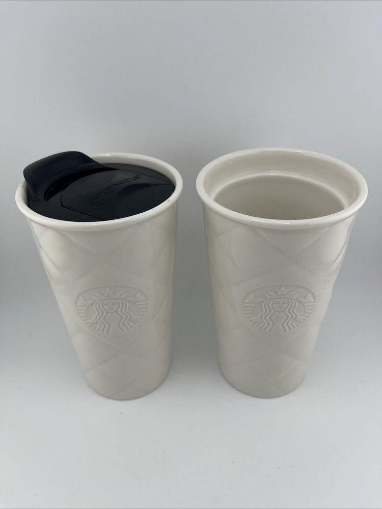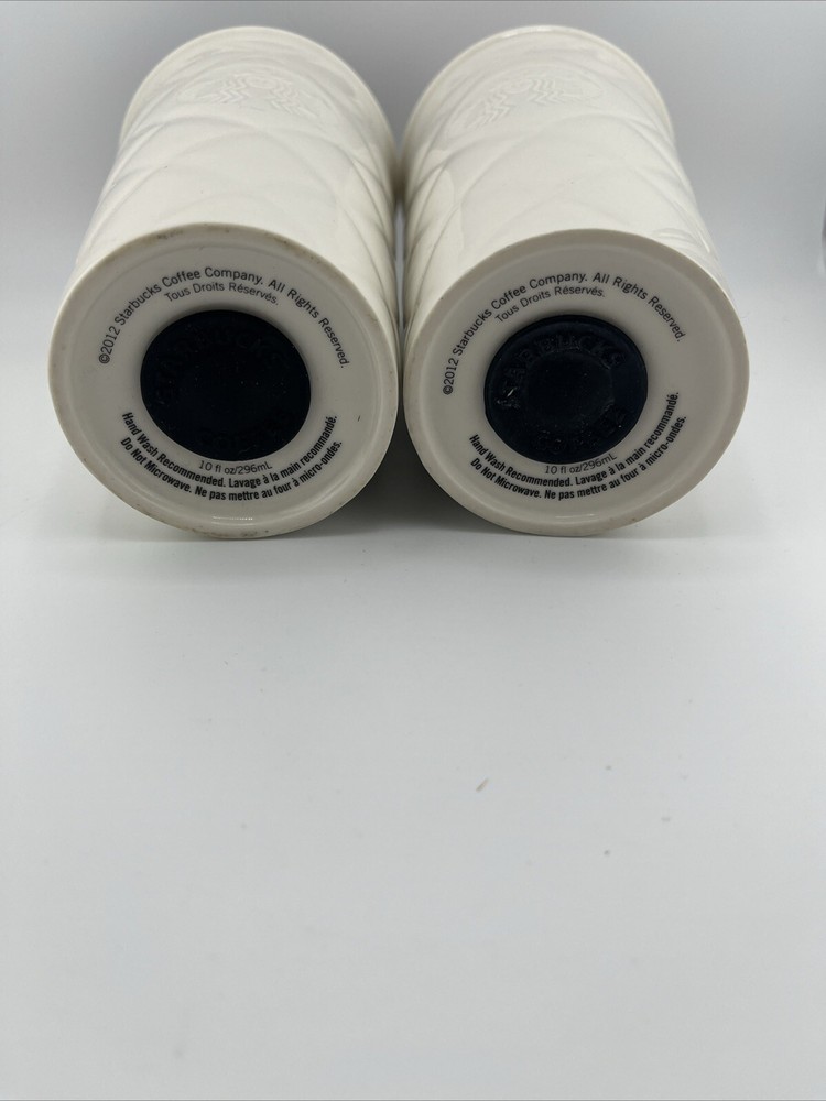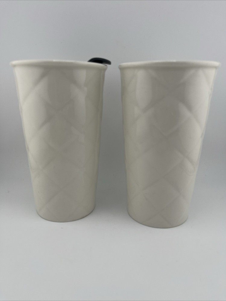 This lot includes two Starbucks 2012 Quilted White Siren Ceramic Tumbler Travel Mugs, each holding 10oz of liquid. The mugs feature the iconic Starbucks mermaid logo and come with one lid each. These original Starbucks travel mugs are perfect for coffee or tea lovers who want to enjoy their favorite drink on the go. Made in China, these mugs are in great condition and are a great addition to any Starbucks collection.