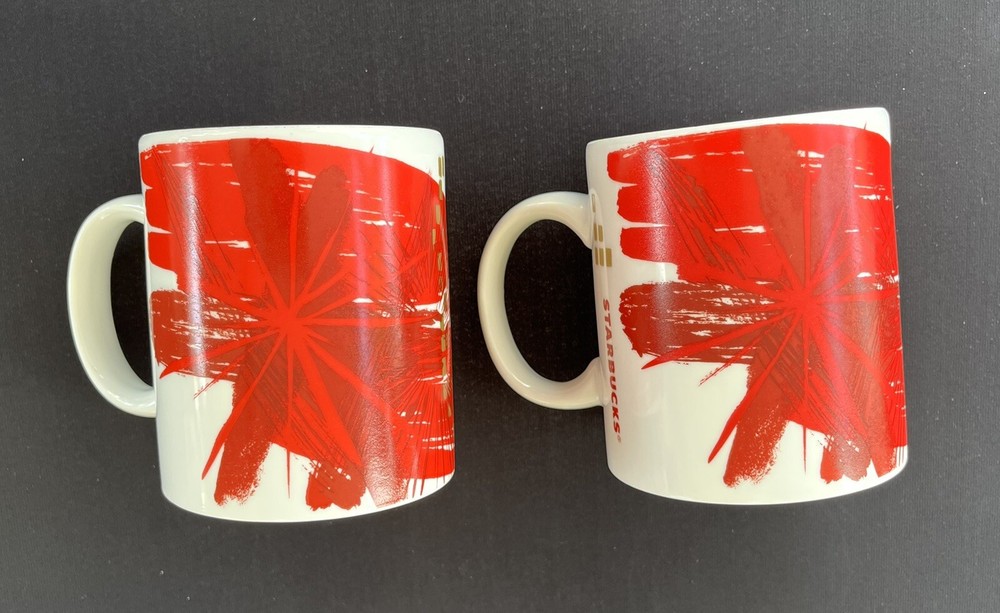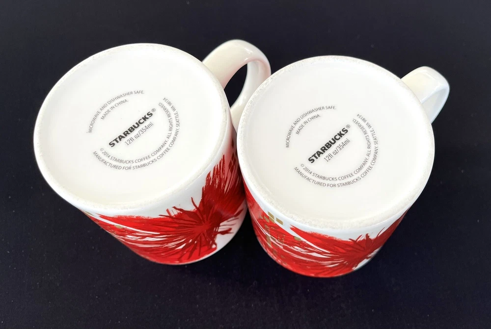 Thi s is for a pair (2) collectible Starbucks 12 oz. mugs for Christmas holiday season from 2014. Each measures about 3.75 inches tall and 3.25 inches across in the opening (not including the handle). Each weighs 10.2 oz. Both mugs are previously owned but excellent and mint as shown. A $1 bill is placed for size reference and not included. Please review pictures, description and ask all the necessary questions before purchasing this item as all sales are final! * * * Non-smoking environment! * * *