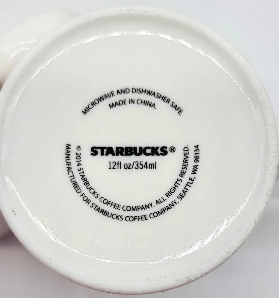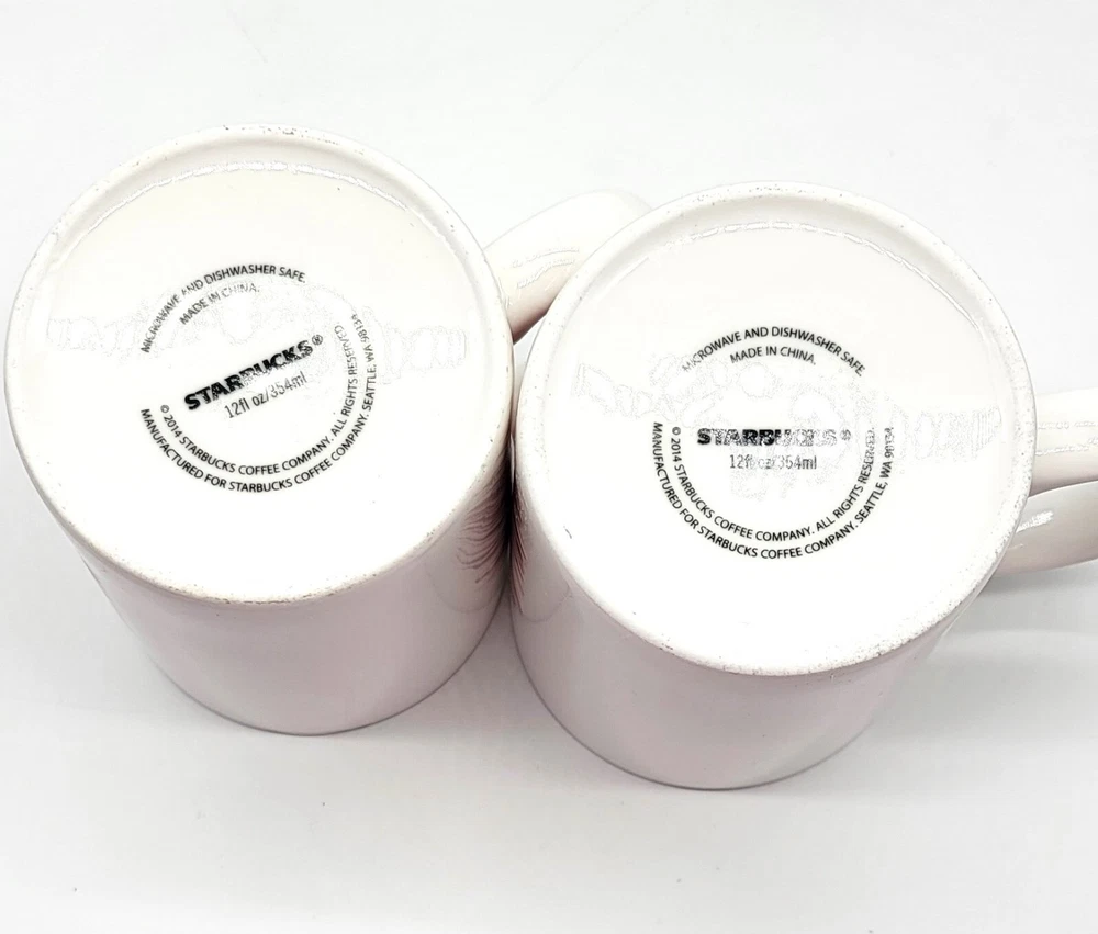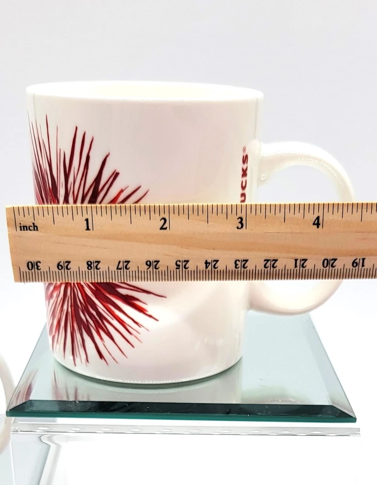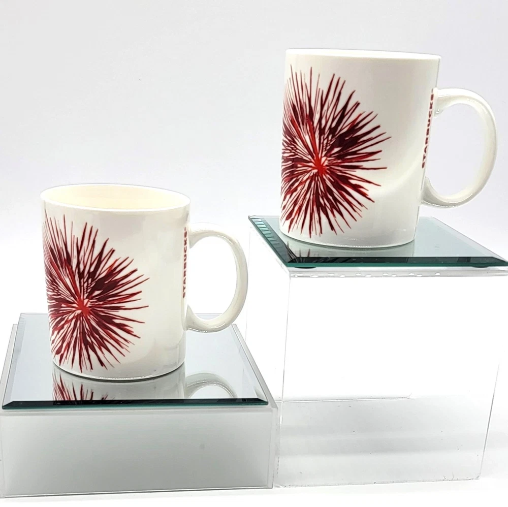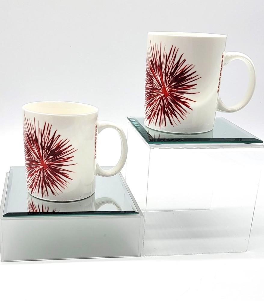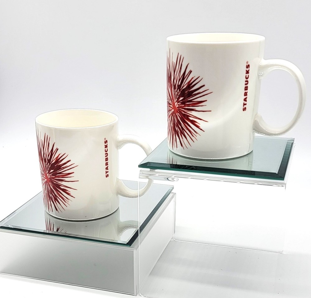 Starbucks Pair 2014 Starburst Red Holiday China/Porcelain Coffee Mugs 12Fl. Oz. This pair of Starbucks Starburst/Fireworks Holiday Mugs are from 2014 and pre-owned. They are a lovely couple and just in time for Holiday cheer! Each one is in beautiful white china/porcelain and have no signs of staining, cracks, chips, or crazing. The colors are bright vivid red against the clean glossy white. Both are dishwasher and microwave safe. Approximately 3 3/4" Tall and 4 1/2" from lip to handle, 12 Fluid Ounces. Please message me with any questions, I am always happy to help.Thanks again for stopping by and have a great evening.