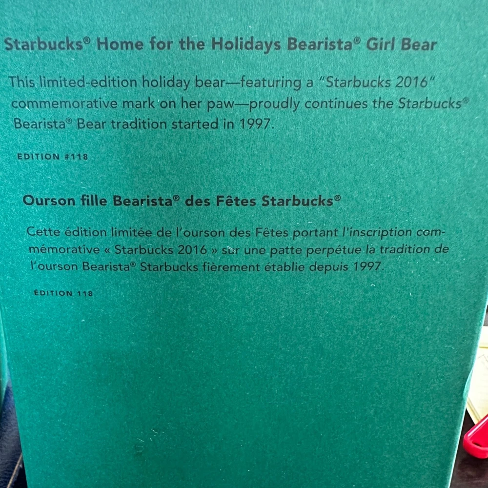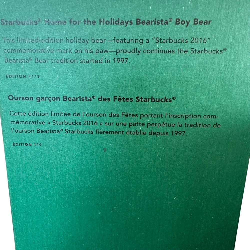These bears aren’t just for cuddling; they’re a fashion icon. Dressed in chic printed sweaters, these bears are ready to hibernate in style. And let's not forget the hat, because even bears know winter is coming. You're not just buying a bear; you're adopting a legend. • Limited Edition 2016 • Faux Fur Hat & Boots • Starbucks Collectible • Approx. 12 Inches Tall New in boxes