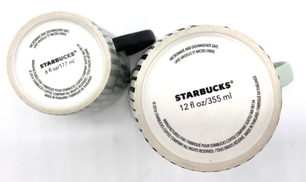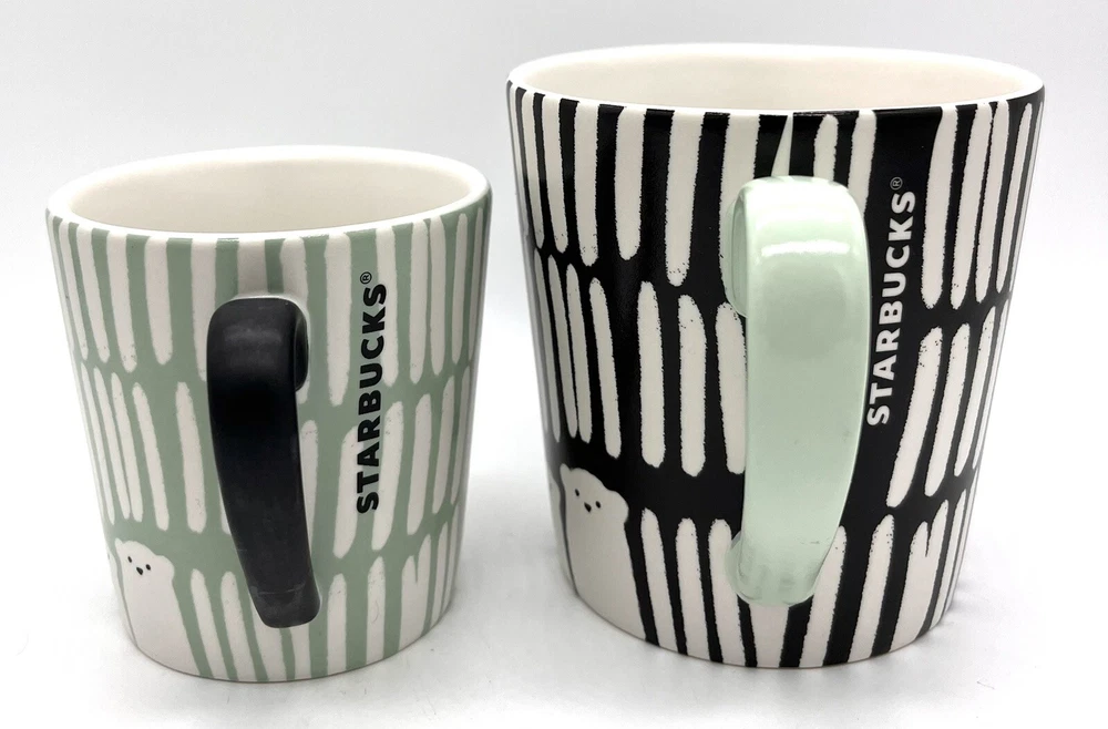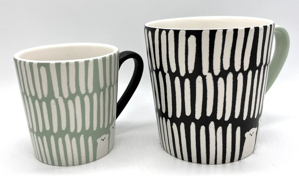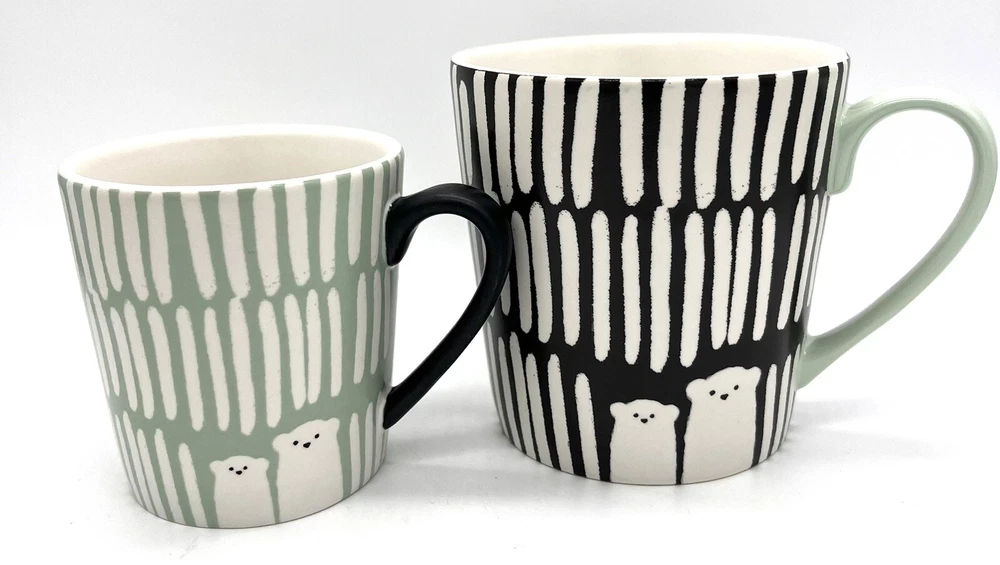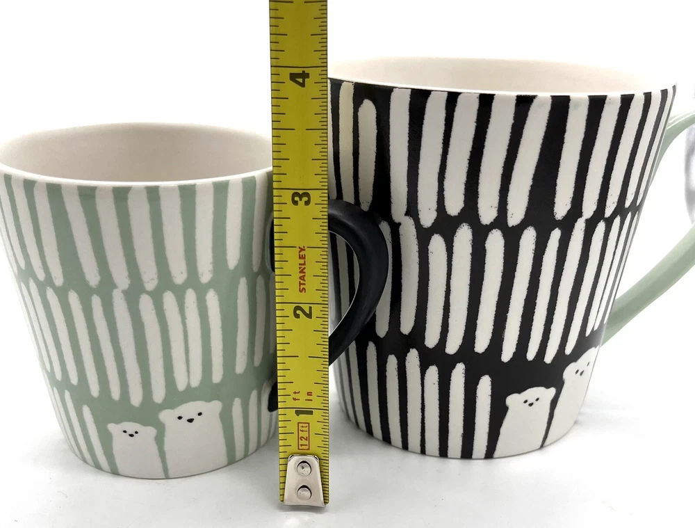 A 2016 Starbucks 2016 Box Set of mint green and black lines on natural ceramic with polar bears - Mommy and Me mug set in the original box and never used. Child mug holds approximately 6 oz and the adult mug holds approximately 12 oz. There are no cracks, chips, or utensil marks. Zoom in on all pictures as they are part of the description.