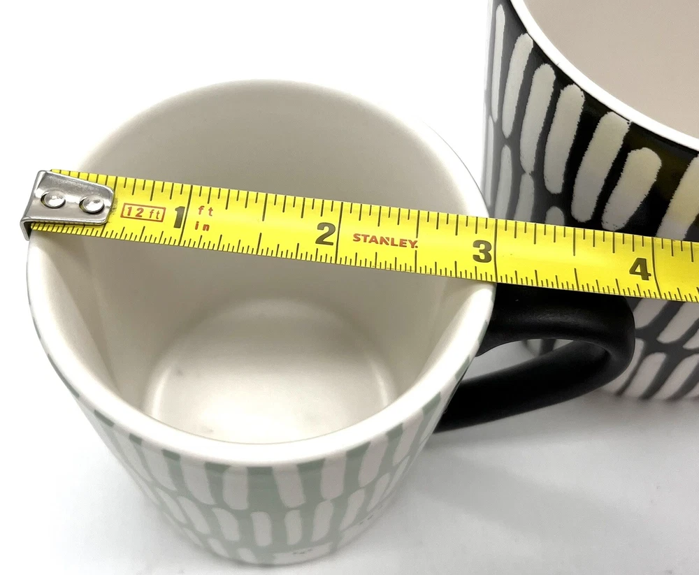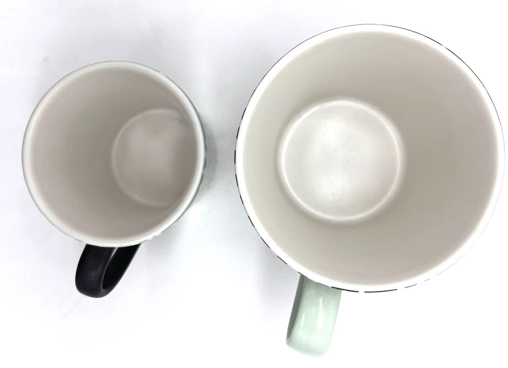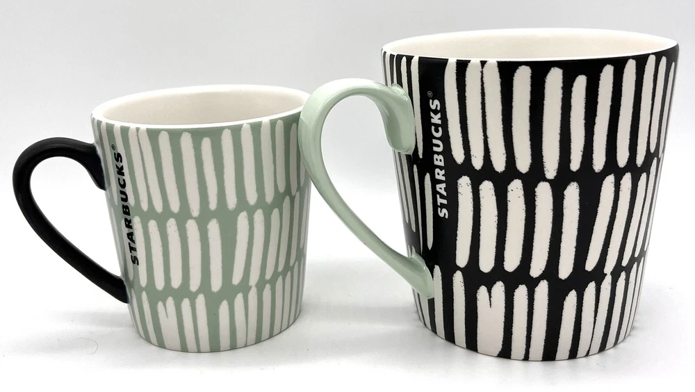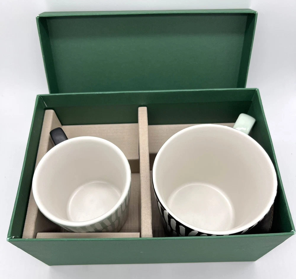 A 2016 Starbucks 2016 Box Set of mint green and black lines on natural ceramic with polar bears - Mommy and Me mug set in the original box and never used. Child mug holds approximately 6 oz and the adult mug holds approximately 12 oz. There are no cracks, chips, or utensil marks. Zoom in on all pictures as they are part of the description.