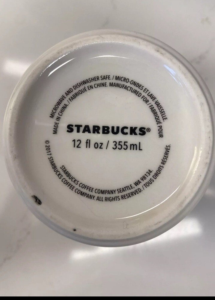 This unique Starbucks coffee mug is a must-have for any collector or coffee lover. Made in 2017, this original ceramic mug features a stunning black and white abstract design with hints of yellow. With a capacity of 12 ounces, it is perfect for your morning coffee or tea.