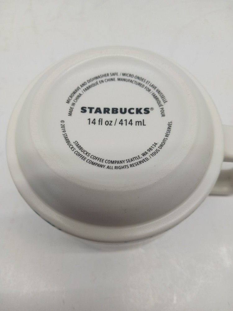 Original/Reproduction:OriginalBrand:StarbucksTheme:Coffee & TeaColor:ivory, teal, & pinkDate of Creation:2019Modified Item:NoFeatured Refinements:Starbucks MugMaterial:CeramicSize:14 OuncesColors:Teal Green on Ivory. Pink insideCountry/Region of Manufacture:ChinaType of Advertising:Mug