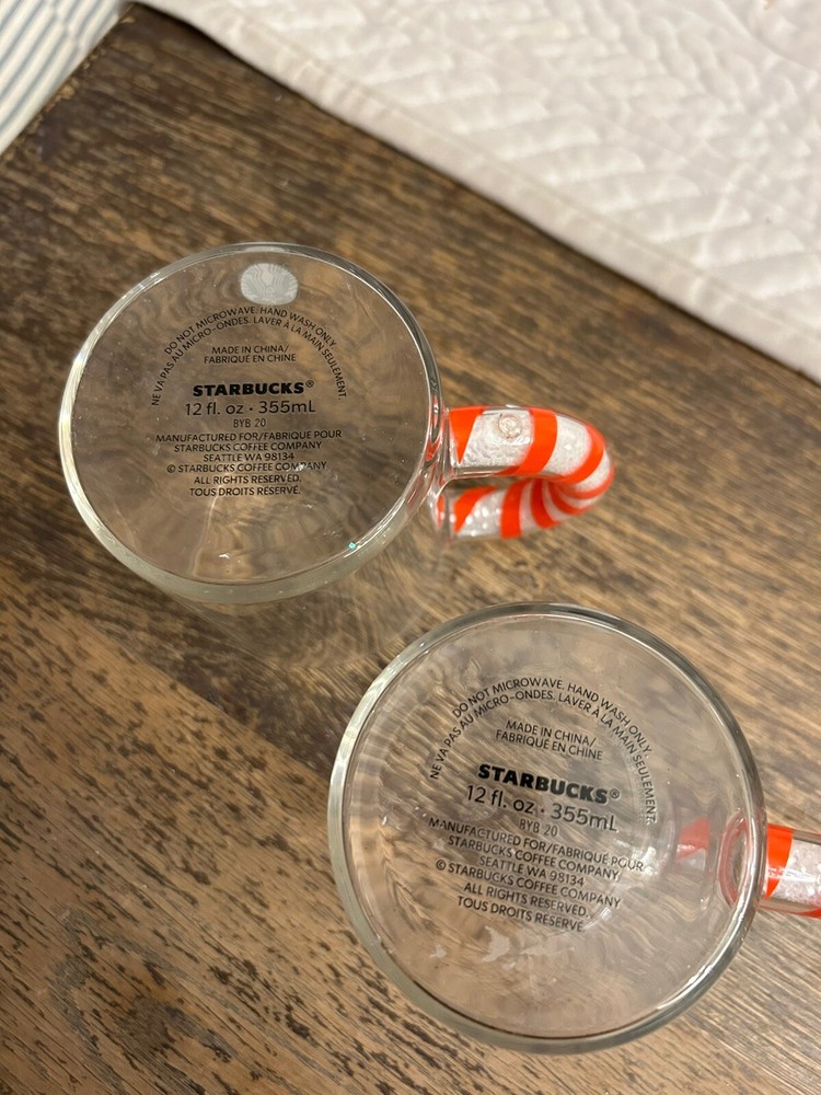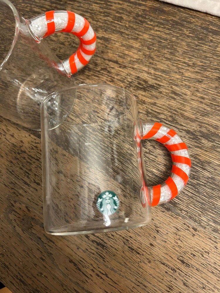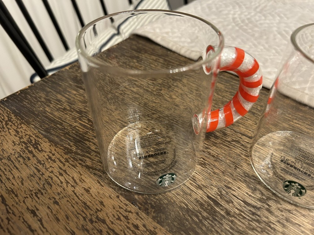 Get into the holiday spirit with this set of two Starbucks coffee cup mugs. Featuring a glittery candy cane design on clear glass. 12 oz mugs in new condition.