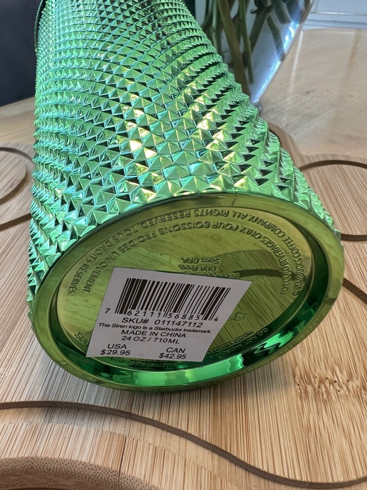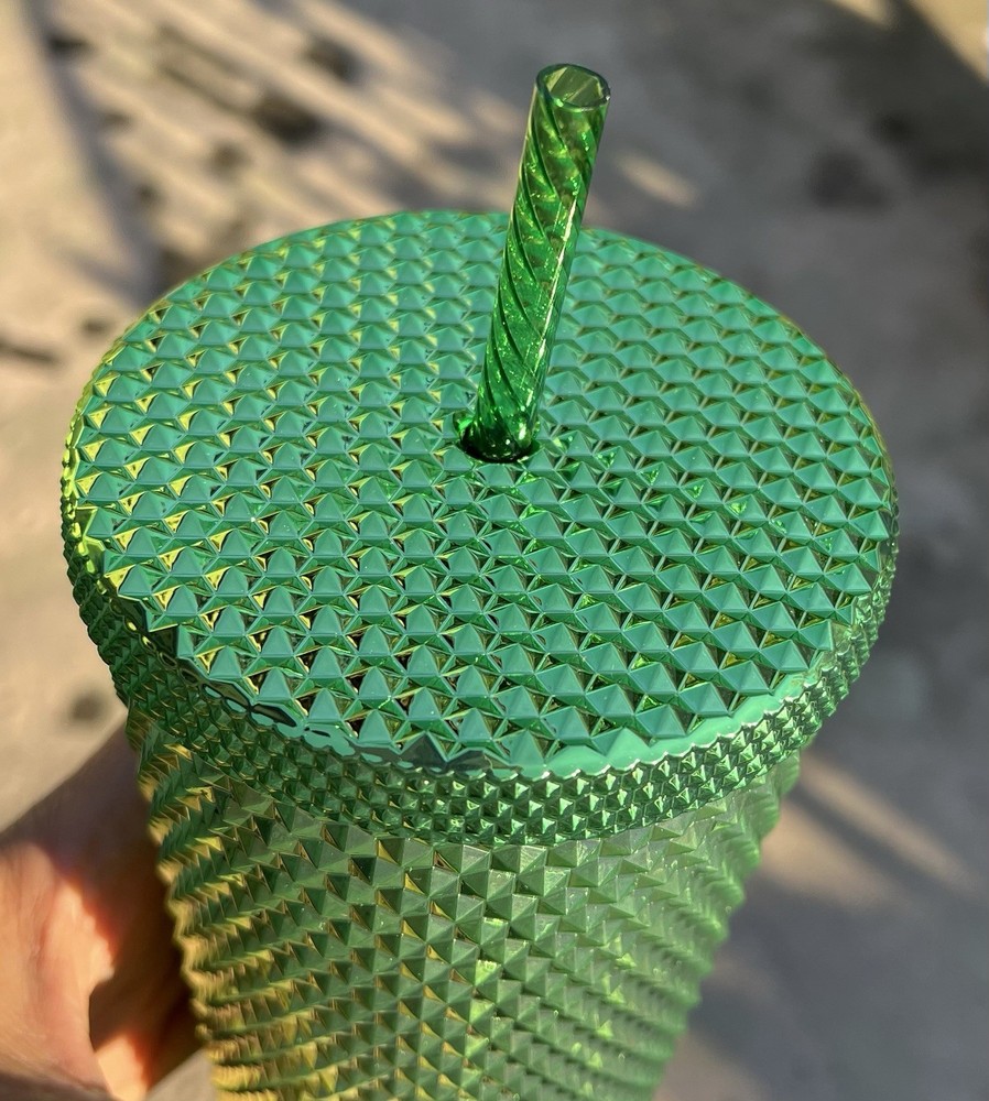 The product is a new Starbucks Metallic Green Studded Cold Cup Tumbler with Straw Diamonds in a 24oz size. This tumbler is part of Starbucks' advertising campaign for coffee and tea, featuring a unique green color and studded design. Manufactured in China, this original tumbler from 2023 does not have any California Prop 65 Warning. Perfect for on-the-go beverages, this tumbler combines style and functionality with the iconic Starbucks brand.