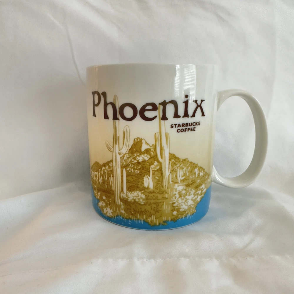 The product is a Starbucks "Been There" mug featuring the city of Phoenix. This collectible mug is part of Starbucks' popular collection that showcases various cities around the world. As a themed coffee and tea item, it is designed for coffee enthusiasts and collectors alike. The mug likely features unique and iconic landmarks and symbols representing Phoenix, making it a sought-after item for Starbucks fans and those looking to commemorate their travels to the city.
