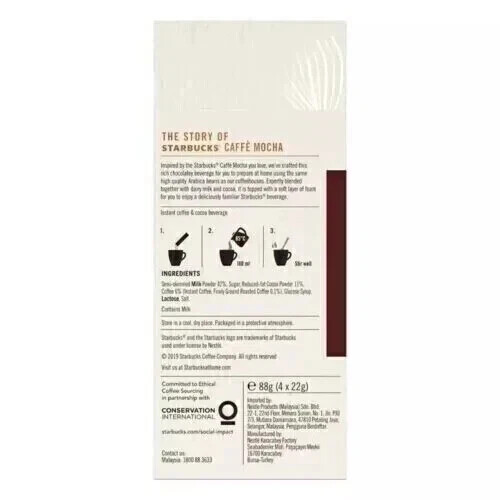STARBUCKS Caffe Mocha (4 sticks x 22g) - Premium Coffee Mix, Rich and Chocolatey ABOUT CAFFÉ MOCHA - We've created this rich and chocolaty mocha drink inspired by the popular Starbucks® Caffè Mocha for you to make at home to get the same wonderful flavor. 100% ARABICA COFFEE BEANS -This box of individual mocha coffee powder is a pleasure at home, made with the same high-quality 100% Arabica premium coffee beans as our coffeehouses, ethically and sustainably obtained. Shipping · All item will be shipped directly from MALAYSIA. · ü Registered Post Item delivered will required signatures at the time of receiving. · ü Dispatched items tracking number will be updated within 24 hrs. Of the dispatch. · ü All items A will be dispatched within 48 hour after receiving the clear payment. · ü All items require 15 to 30 business days to arrive at the given address . · ü Please do not order if you are not willing to wait for above given time. · ü All our items will be shipped worldwide, In any case the item is been stuck to the buyers custom department the buyer has to pay the custom charges for the receiving of the item. · ü If you need express delivery we can arrange by DHL, Aramex, Fedex & UPS delivery time period 3-5 working days for more details please contact us through eBay message. *condition apply* MLV 236145839682 00120JOY