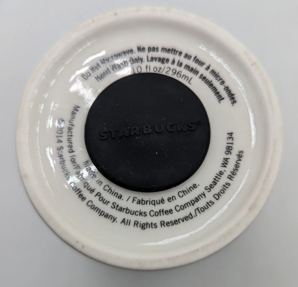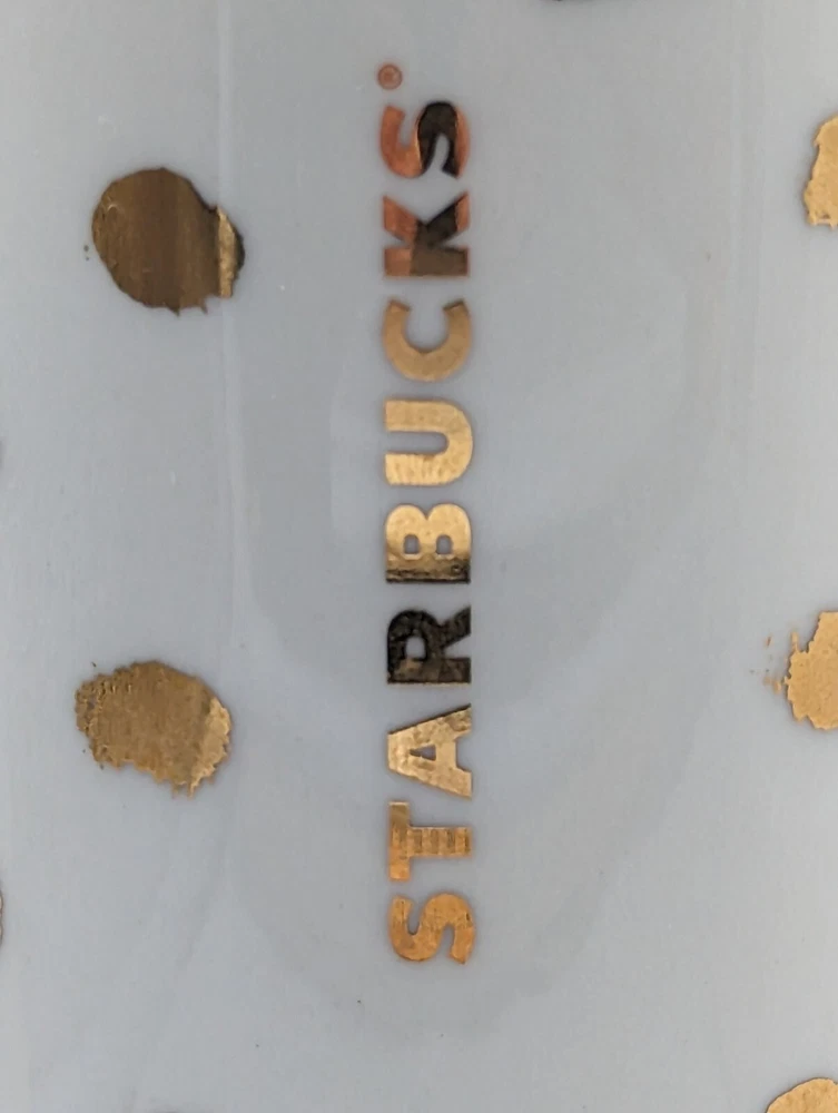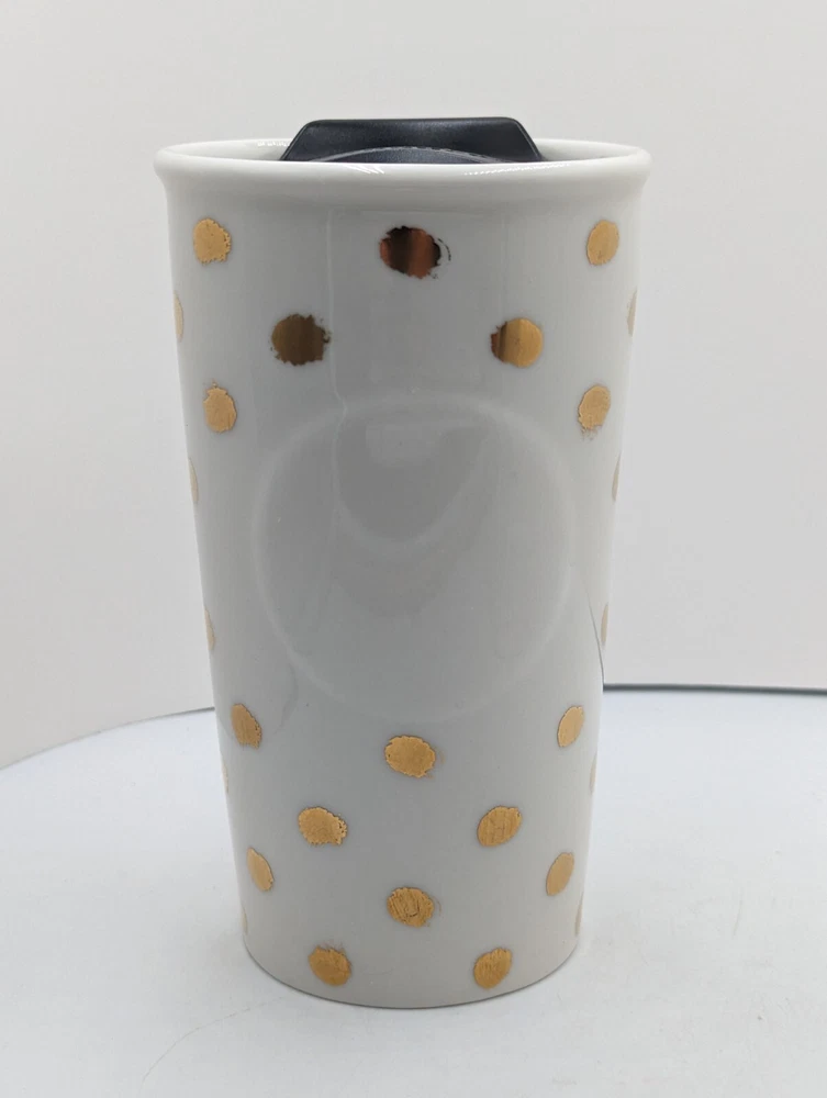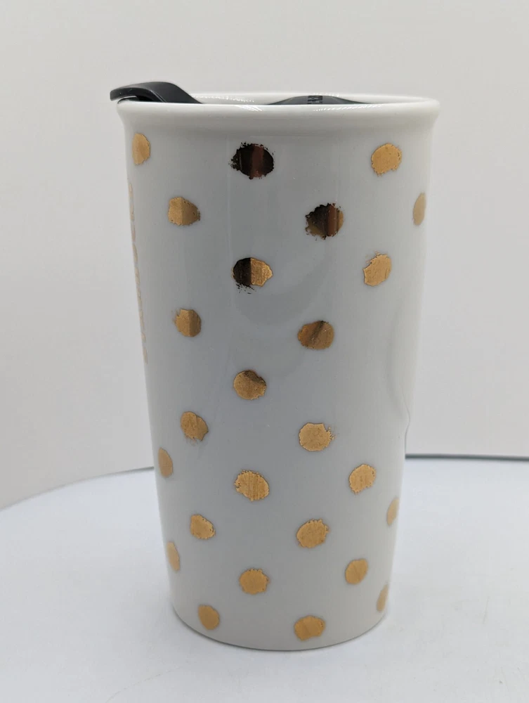 Starbucks Ceramic 2014 Gold Polka Dot Collection Travel Mug Tumbler w Lid 10 oz. Very nice pre-owned condition with no damage. I think the original lid was white and since this one is black, I believe it may be a replacement but this is the way it was purchased and it fits perfectly. This mug is double walled to keep your beverage hot longer. All of my items are carefully packed for shipping, no matter their value - $5 items are wrapped with the same care as a $200 item. My goal is to have your purchase arrive safely. I use recycled packaging when possible but mostly use new, high quality products so your item will arrive intact without damage. Large, heavy and fragile items are harder to use combined shipping with but just ask if you would like to purchase more than one item and I am more than happy to do so if feasible. If not, maybe we can work out a shipping discount. Thank you and hopefully you will visit my store again!