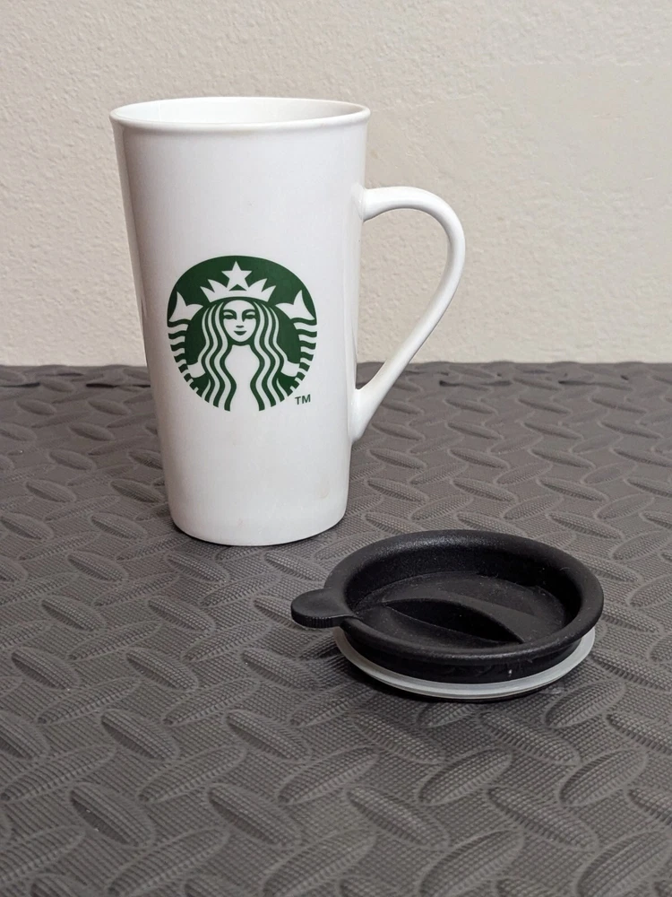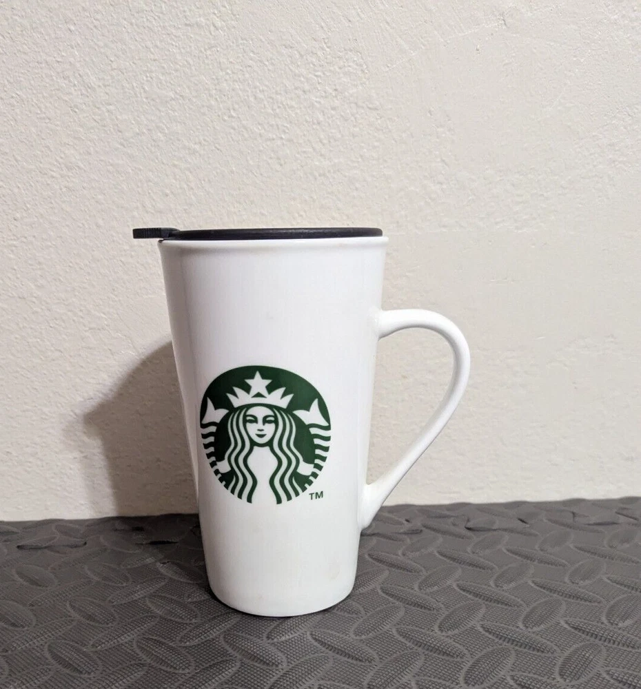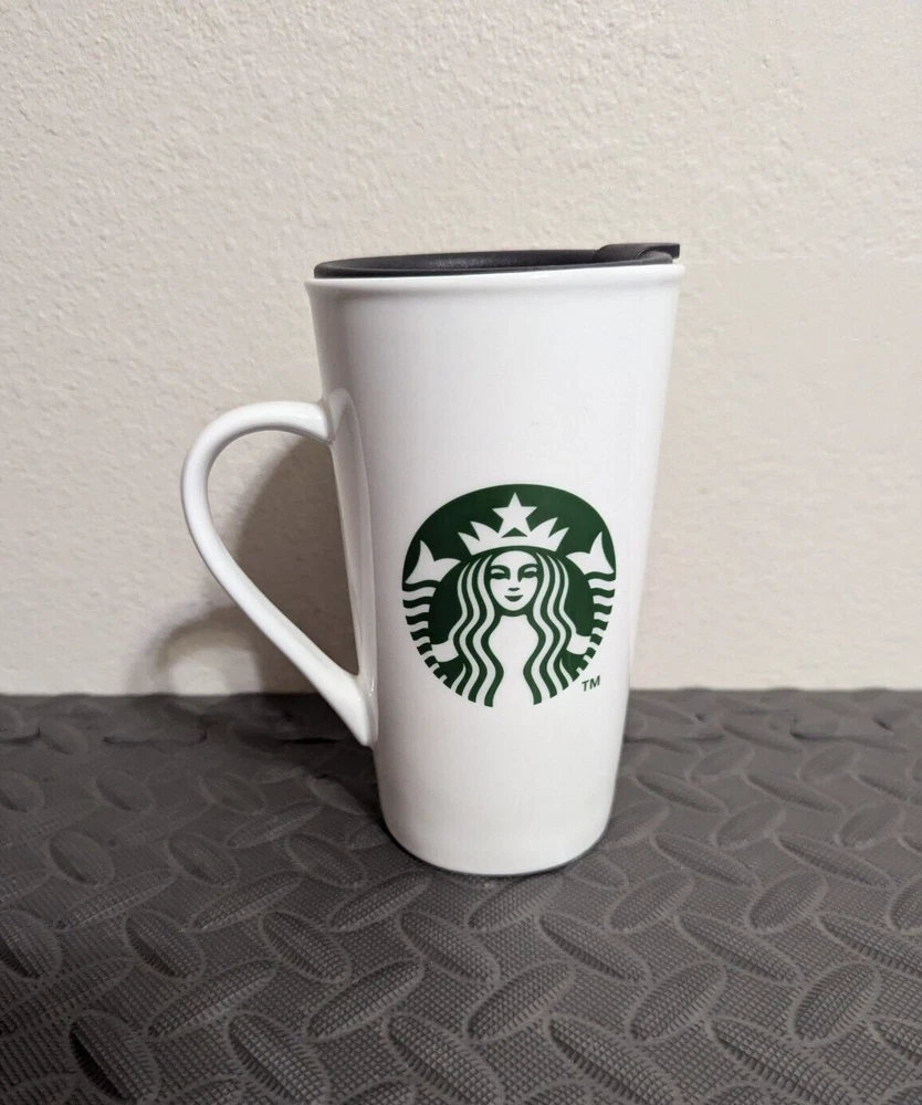 "STARBUCKS CERAMIC TUMBLER TRAVEL MUG WITH LID" 16oz. WHITE WITH LOGO ON BOTH SIDES 2014 Starbucks ceramic travel tumbler with lid; 16oz. White with green logo on both sides. Includes lid. From 2014. Excellent, gently used condition. Thanks for looking and have a great day!