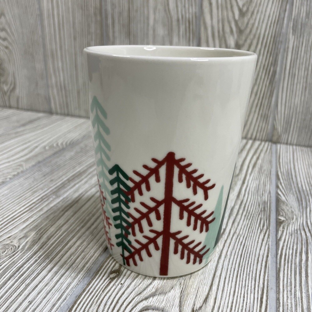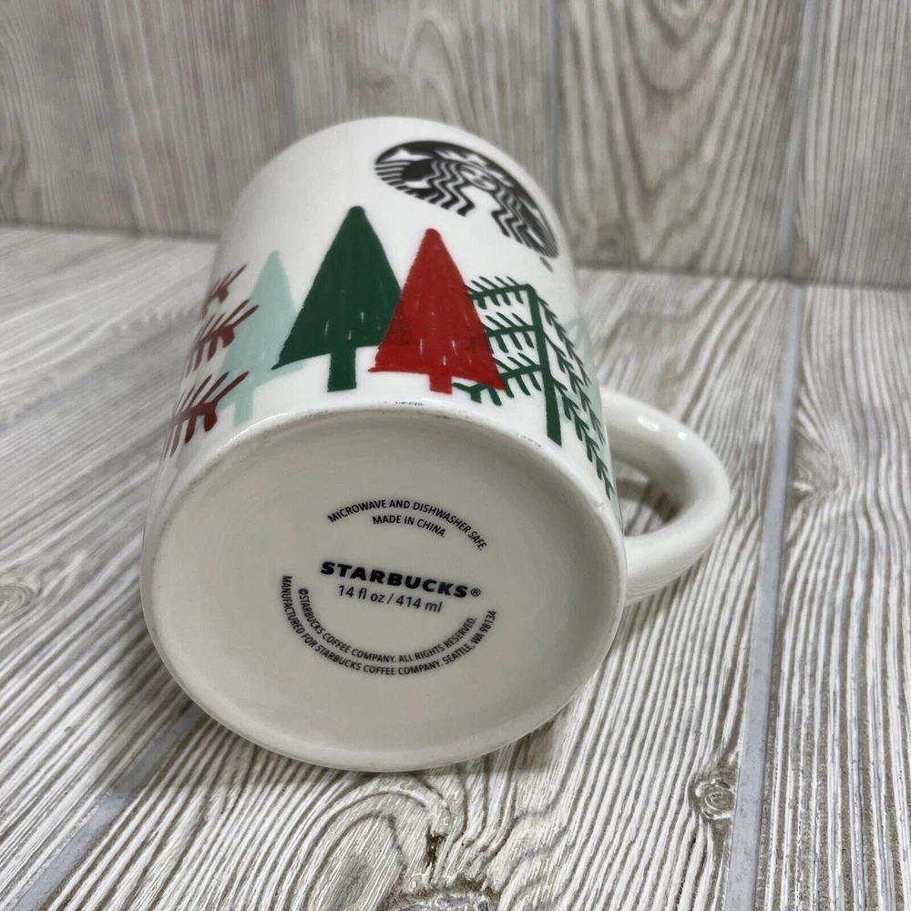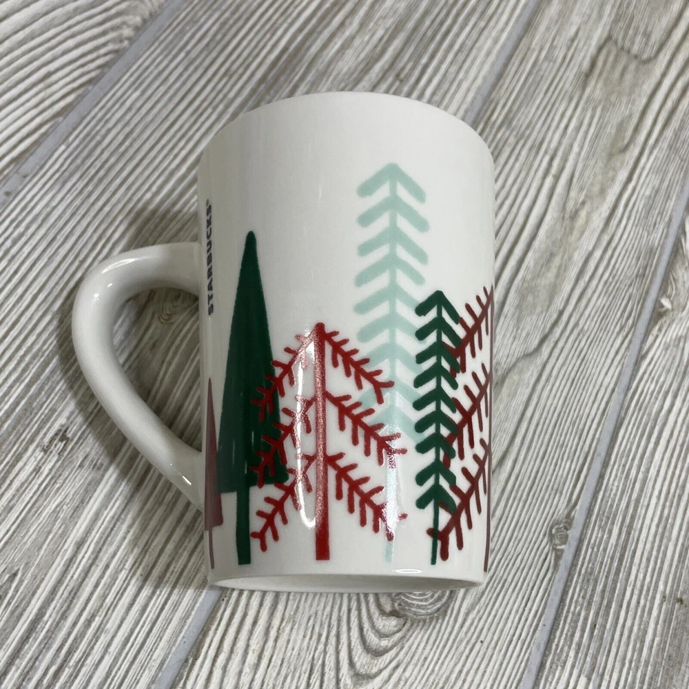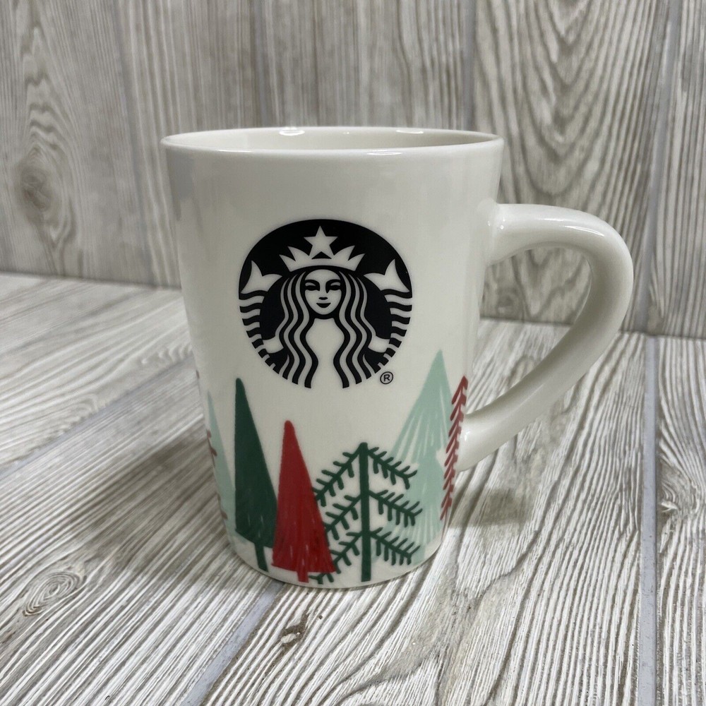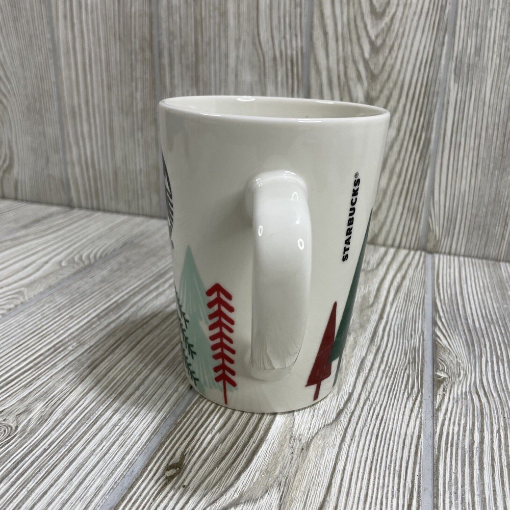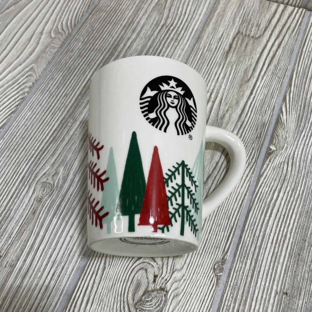 For sale is this Starbucks Christmas Holiday Coffee Mug Cup. White, featuring Green & Red Trees. Holds 14.4 fl oz. Good condition, see photos.