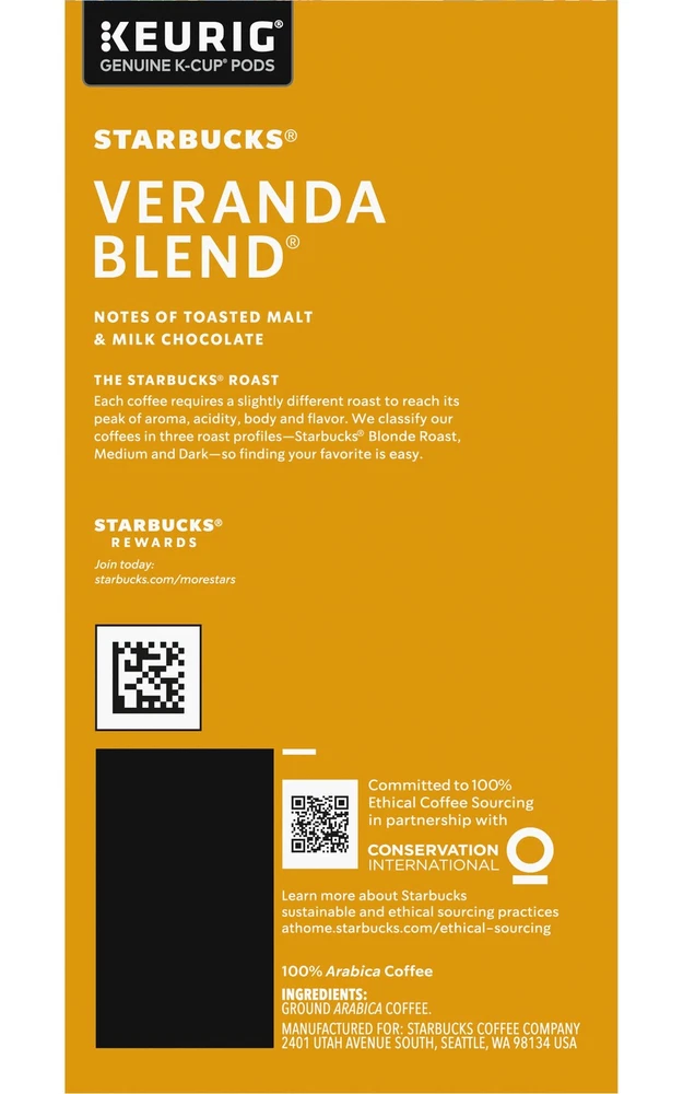 Starbucks Coffee K-Cup Pods, Veranda Blend, Blonde Roast 72 Count (Pack of 3) Description Starbucks Veranda Blend Ground Coffee, Blonde Roast (72 K-Cups) Features: Product Details: Handling We will ship all orders within 1 business day of payment. Delivery We Do Not Ship Outside of the Continental US. Return Policy All items qualify for returns within 30 days of receipt. Buyer is responsible for return shipping on any item that is not damaged. Feedback We take our reputation seriously, we buy and sell online, so we understand the value of trust. If you are unsatisfied with your order, please contact us and we will work with you to resolve it to your satisfaction.
