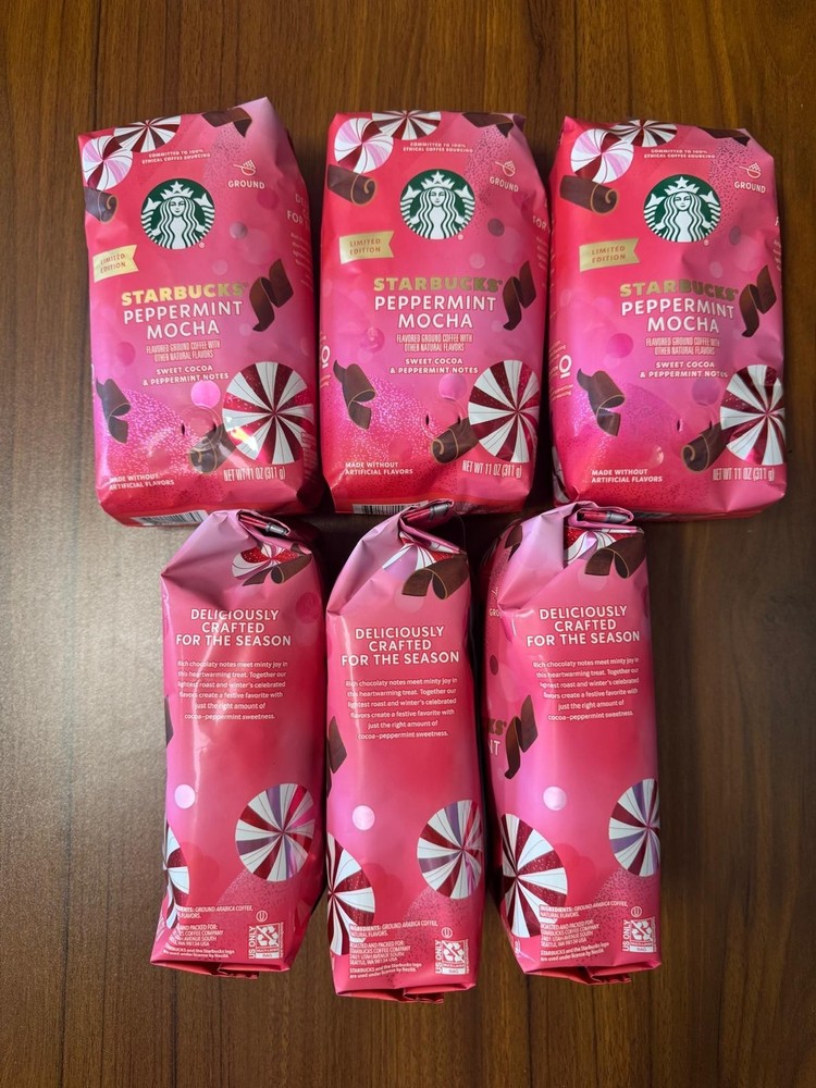 6 PACK The product is Starbucks Coffee Peppermint Mocha Ground Light Roast, a limited edition flavored ground coffee with a peppermint and chocolate flavor profile. It is dairy free, egg free, and gluten free, making it suitable for various dietary restrictions. This Fairtrade coffee is certified organic and has no artificial flavoring or coloring, featuring natural flavors instead. With an expiration date of 04/25/2026, each pack includes 6 bags of 11 oz each, perfect for holiday gatherings or everyday enjoyment. Made in the United States, this coffee offers a festive and cozy drinking experience.