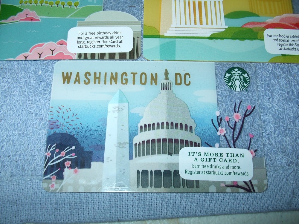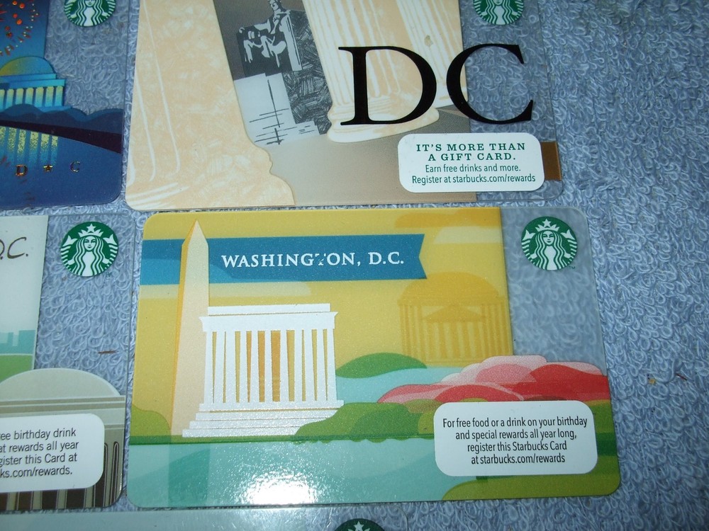Starbucks Collectible Gift Cards. Washington DC. Set of 5 MINT CONDITION CARDS. No loaded value. Never loaded never swiped. Worldwide shipping. There is a five day ship time on all items if you cannot wait please ask in advance if we were able to ship earlier, items are also shipped from Arizona and Maryland as it is where my partner is we will let you know which location has been shipped fromA friend and I are working this page. We are just selling some of our own items. This is not a business. It is strictly just us cleaning up and making some room. We do have a five day shipping. On our items as we have regular jobs and this is like I said just to get rid of some of our own stuff so please be patient. If you can?t wait to five days for shipping please let us know we will try to accommodate
