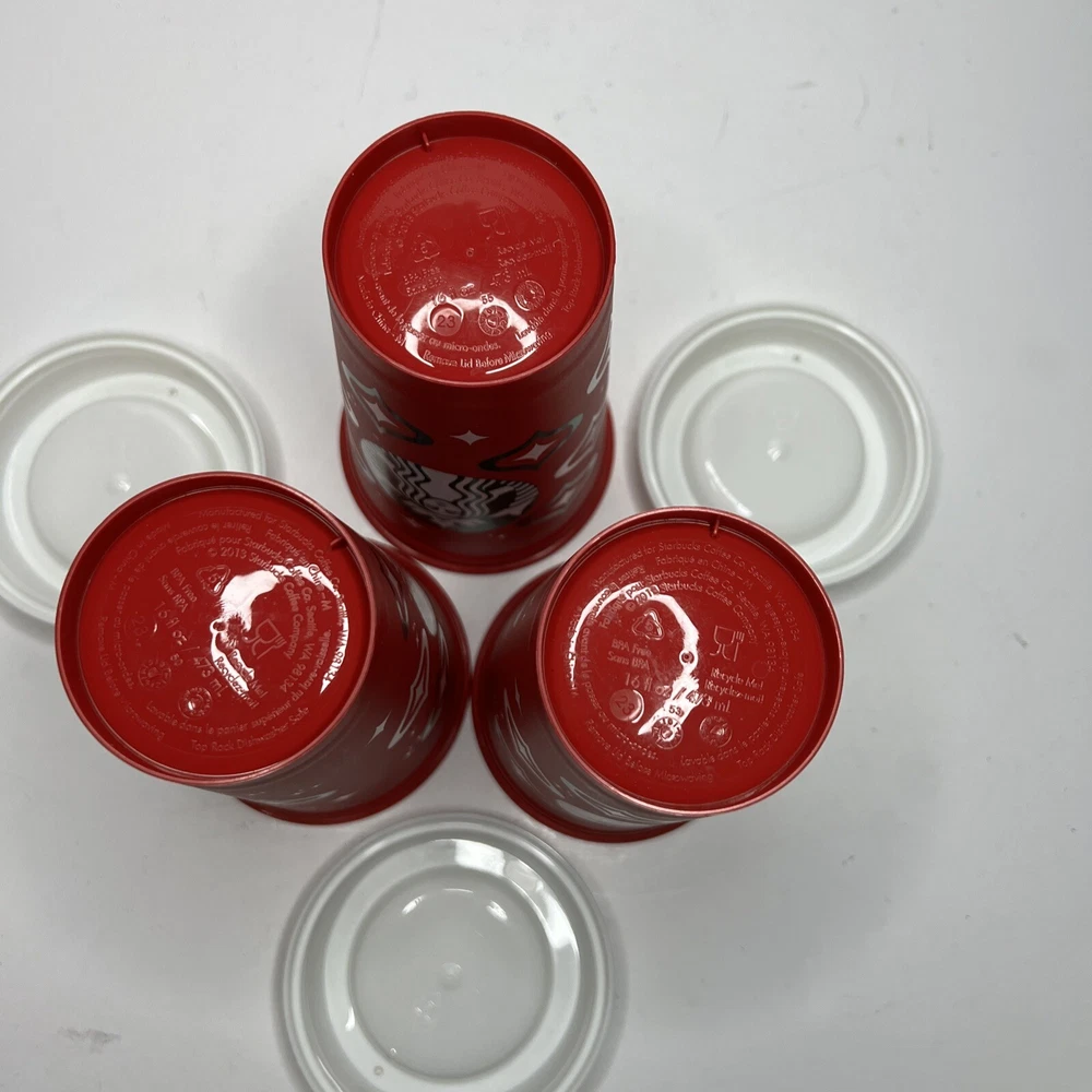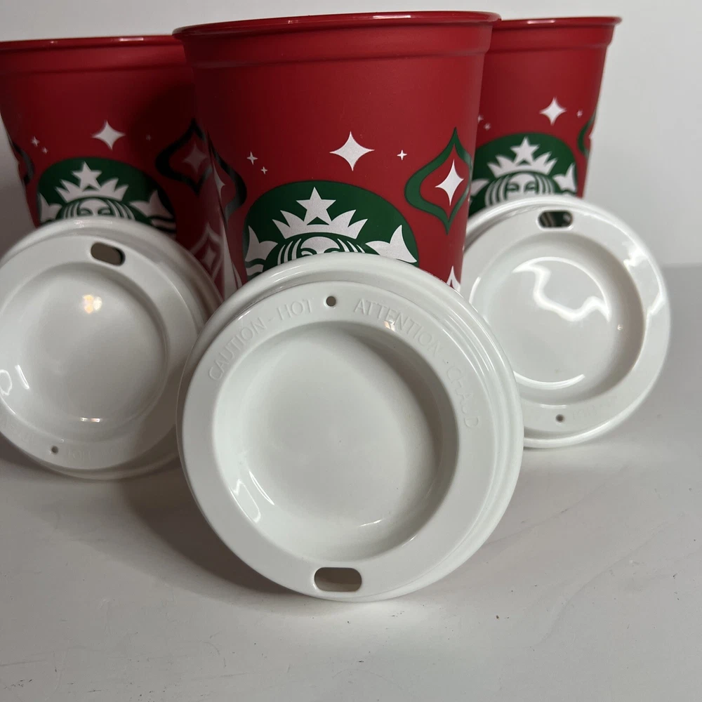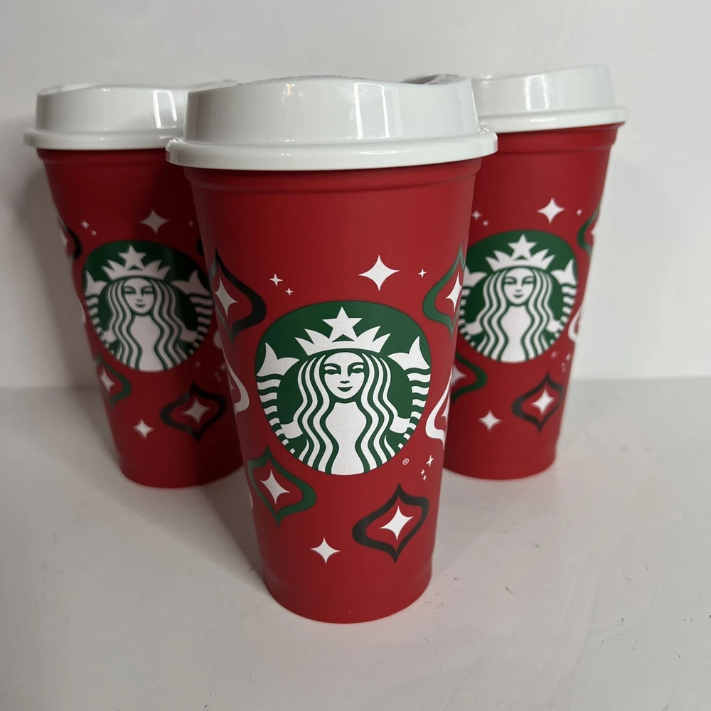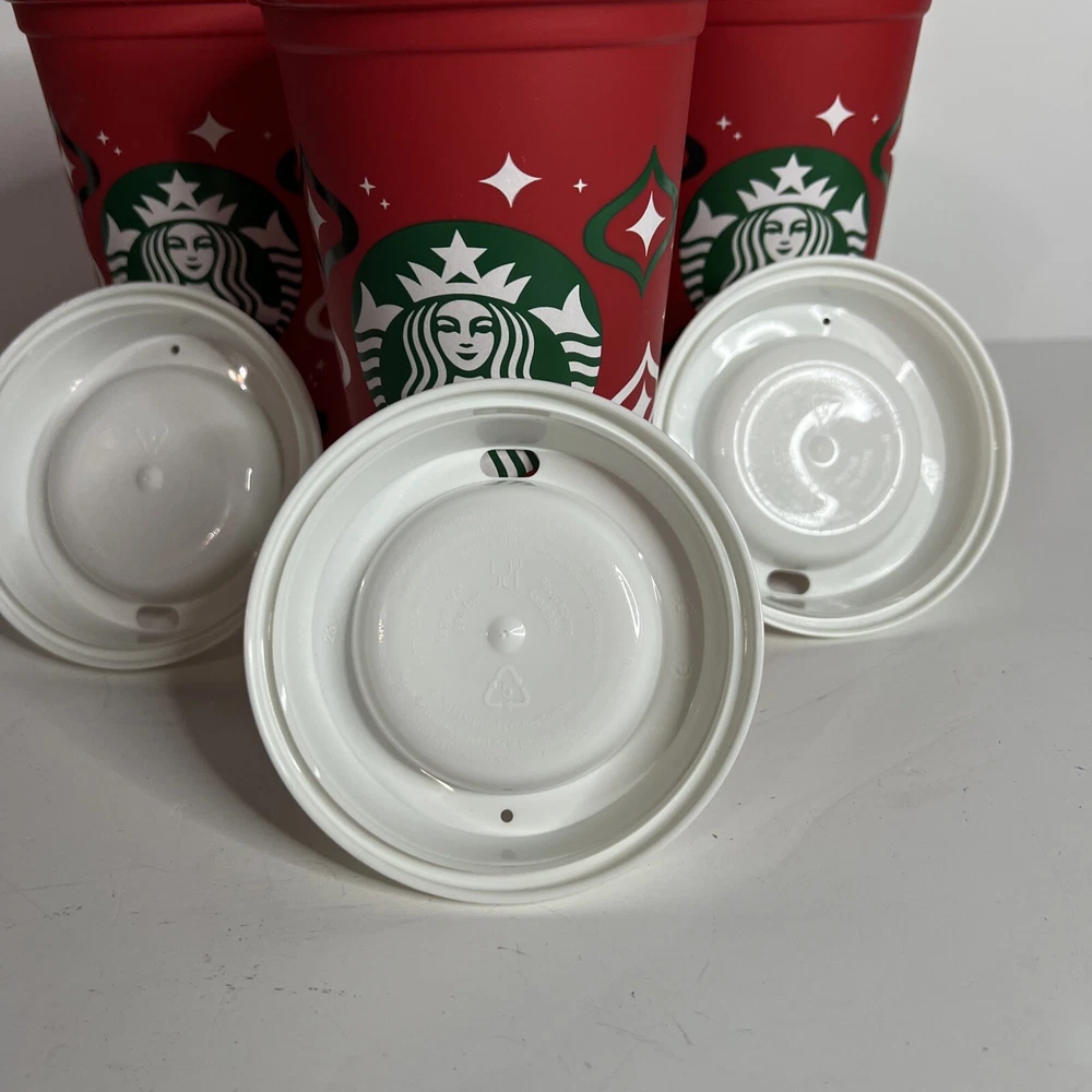 Set of 3 - 2023 Starbucks, Holiday reusable, hot drink cups with lids. These were rinsed out with the intention of being used but never used. Have been stored since. See pictures please.