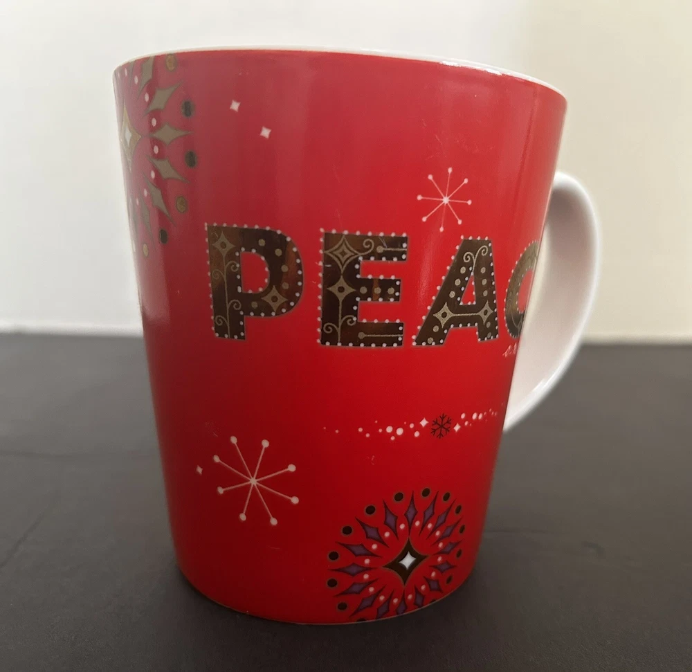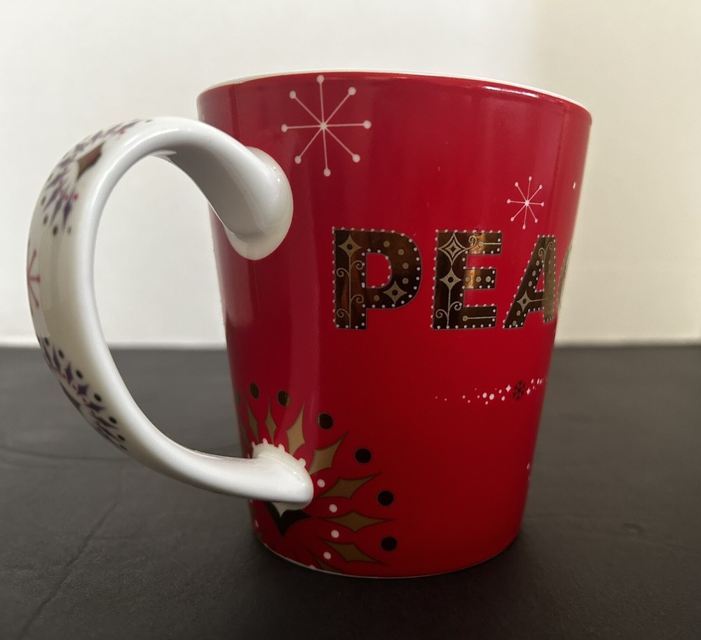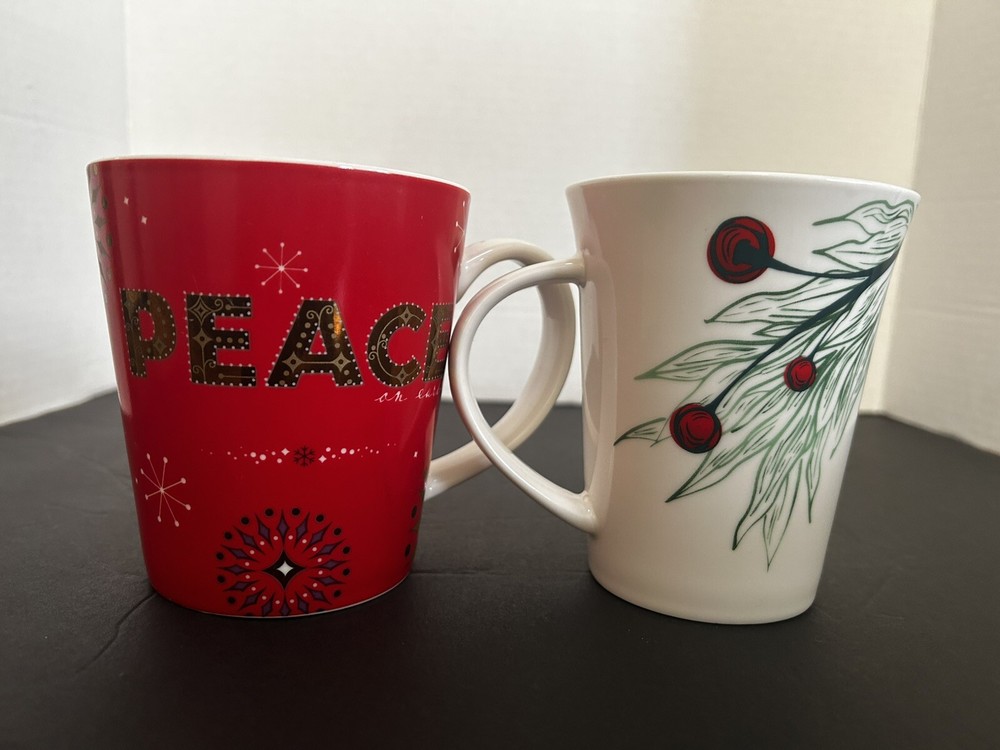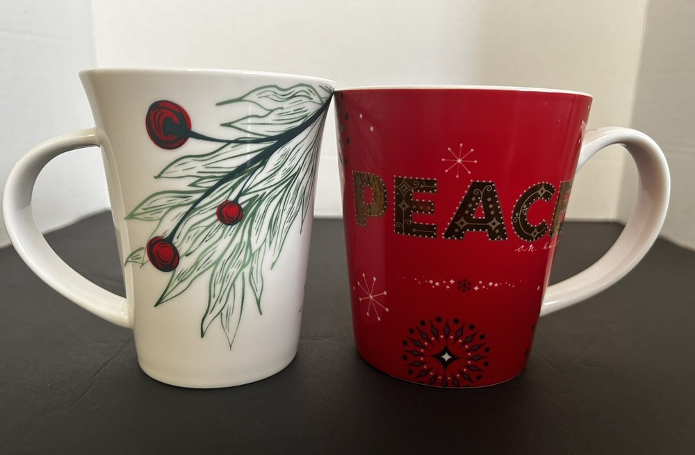 This is a set of two Starbucks holiday/Christmas cups or mugs, the red Peace mug, a rare find from 2006, hand wash only, and the red, green and white Holly Berry pine from 2020 which is microwave and dishwasher safe. These are original pieces and perfect for collectors of coffee and tea accessories. The mugs are branded with the Starbucks logo and are ideal for enjoying your favorite hot beverage during the holiday season. Add them to your collection of Starbucks merchandise or give them as a gift to a fellow coffee lover. No cracks, chips; good used condition.