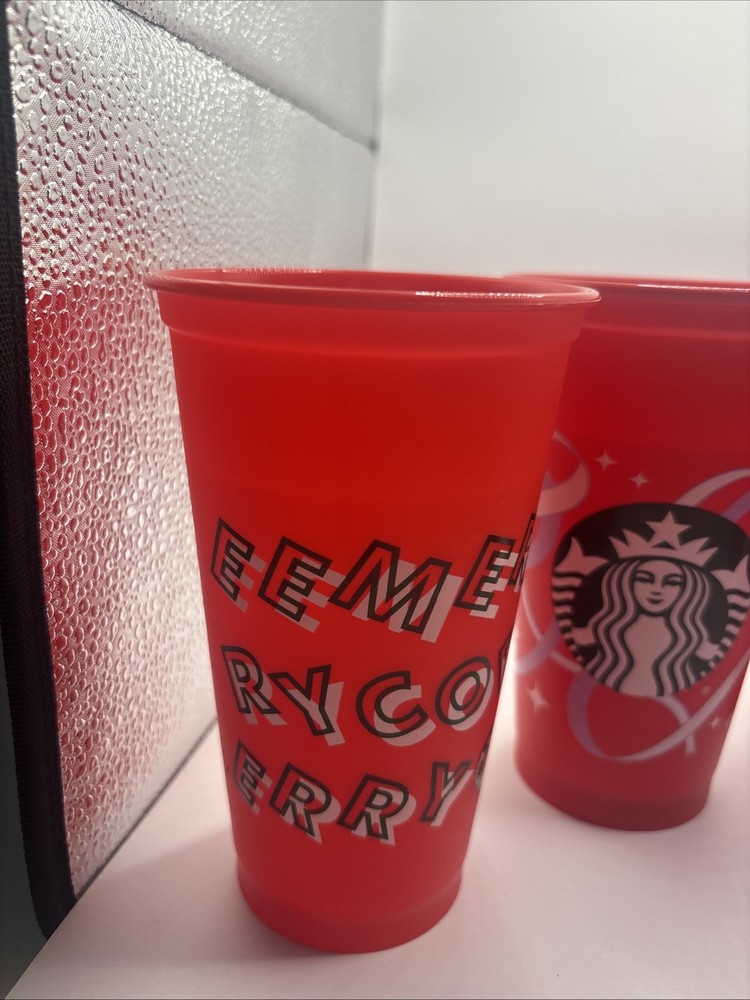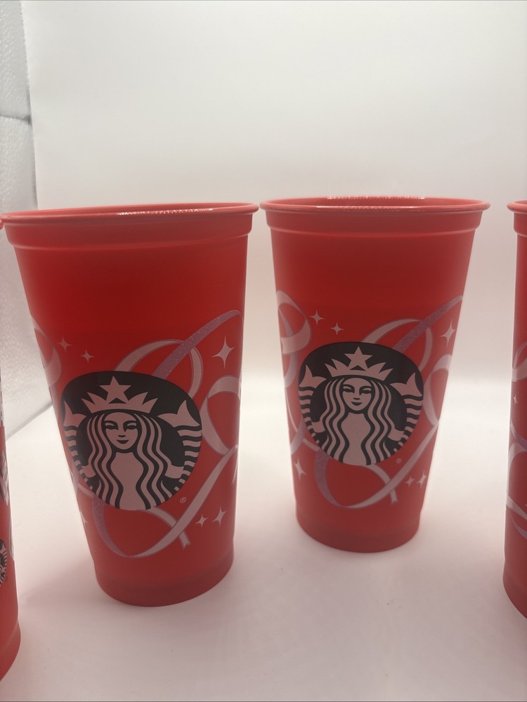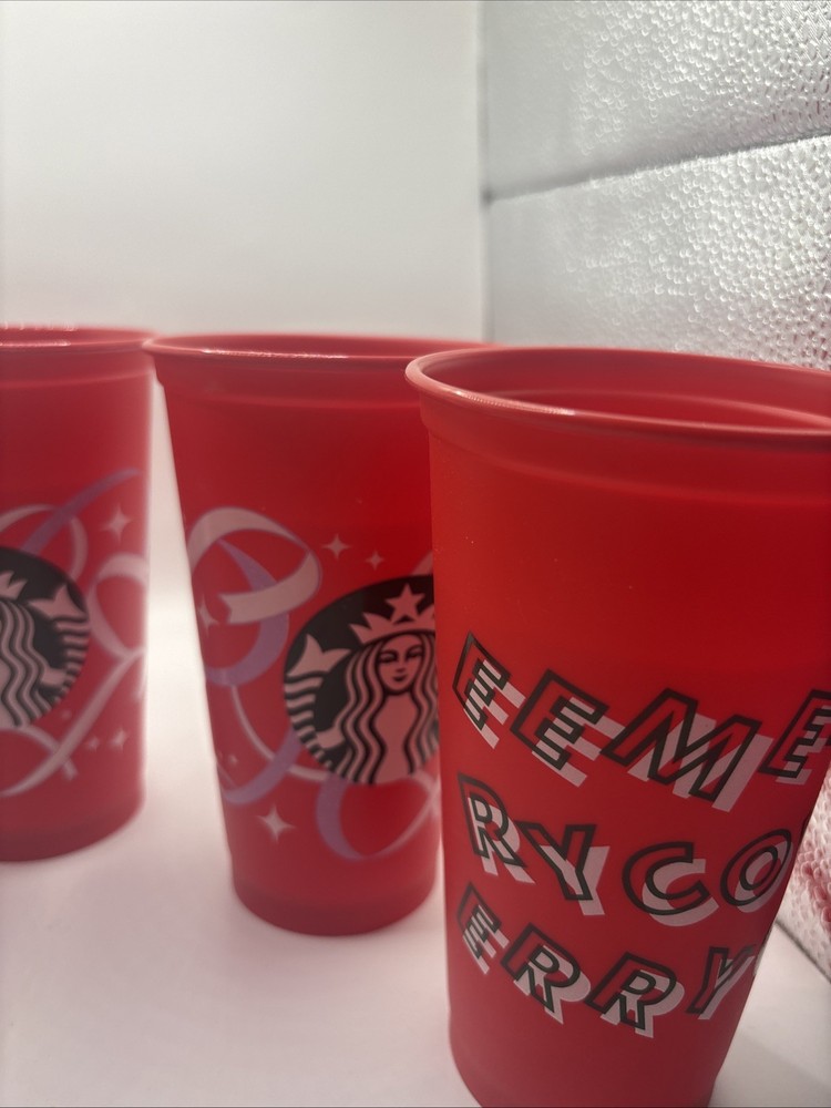This product is a lot of five reusable hot coffee cups featuring a festive red color and a holiday theme. Created by Starbucks in 2019, these original cups are perfect for collectors of Starbucks memorabilia or enthusiasts of coffee and tea advertising. The cups are great for enjoying a warm drink while showing off your love for the Starbucks brand during the holiday season.
