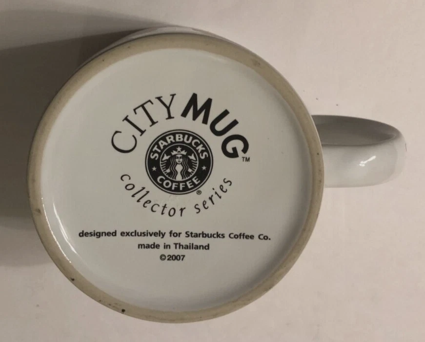 2007 Starbucks Coffee Co. Collector Series Hong Kong Ceramic Coffee Mug *Combined Shipping Accepted (2+) *Dimensions: 3 3/4" D x 4 1/4" H *Weight: 1.3 lb. (ea.) *Capacity: 8-10 oz. *Color: White Condition: Pre-owned.