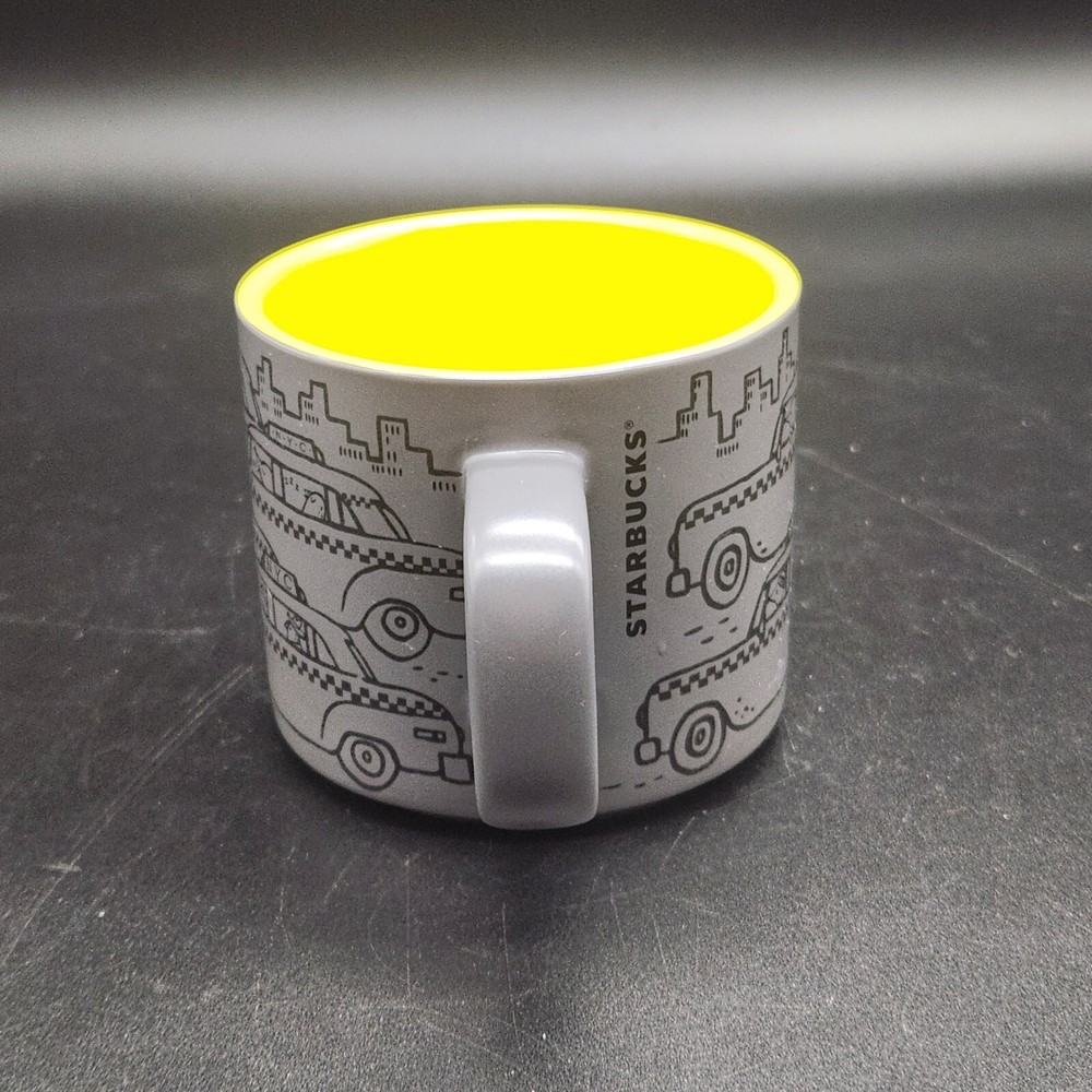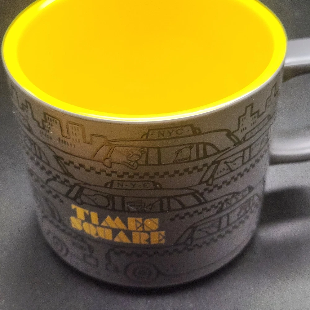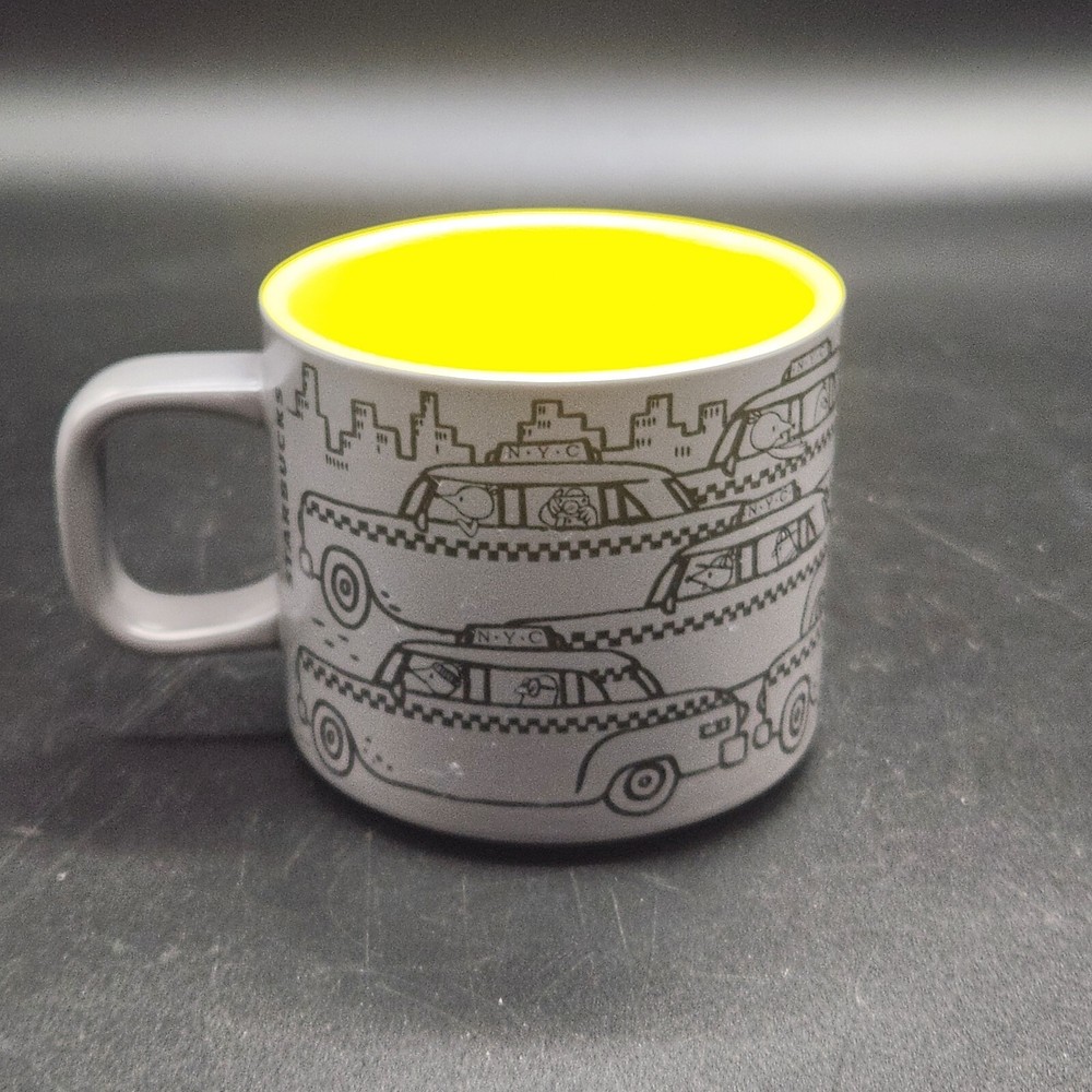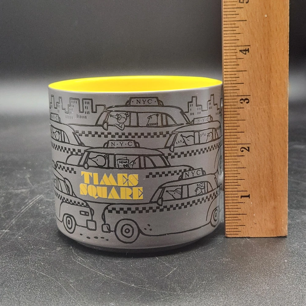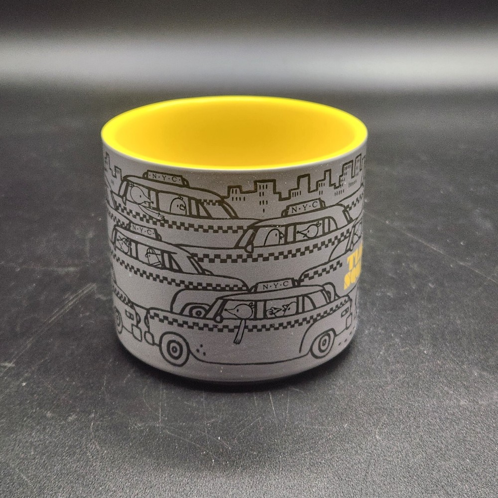 Start your day with a laugh and this whimsical Starbucks Times Square mug. Featuring NYC taxis driven by cartoon characters, it's like rush hour in your cupboard. Sip your coffee while imagining you're stuck in traffic, but at least you're at home, not in a cab with a penguin. • 12 fl oz capacity • Microwave & dishwasher safe • Unique NYC taxi design • Bright yellow interior • Durable ceramic material Top to bottom = 3.25 inches Used but in excellent condition. No chips or cracks. See photos for details.