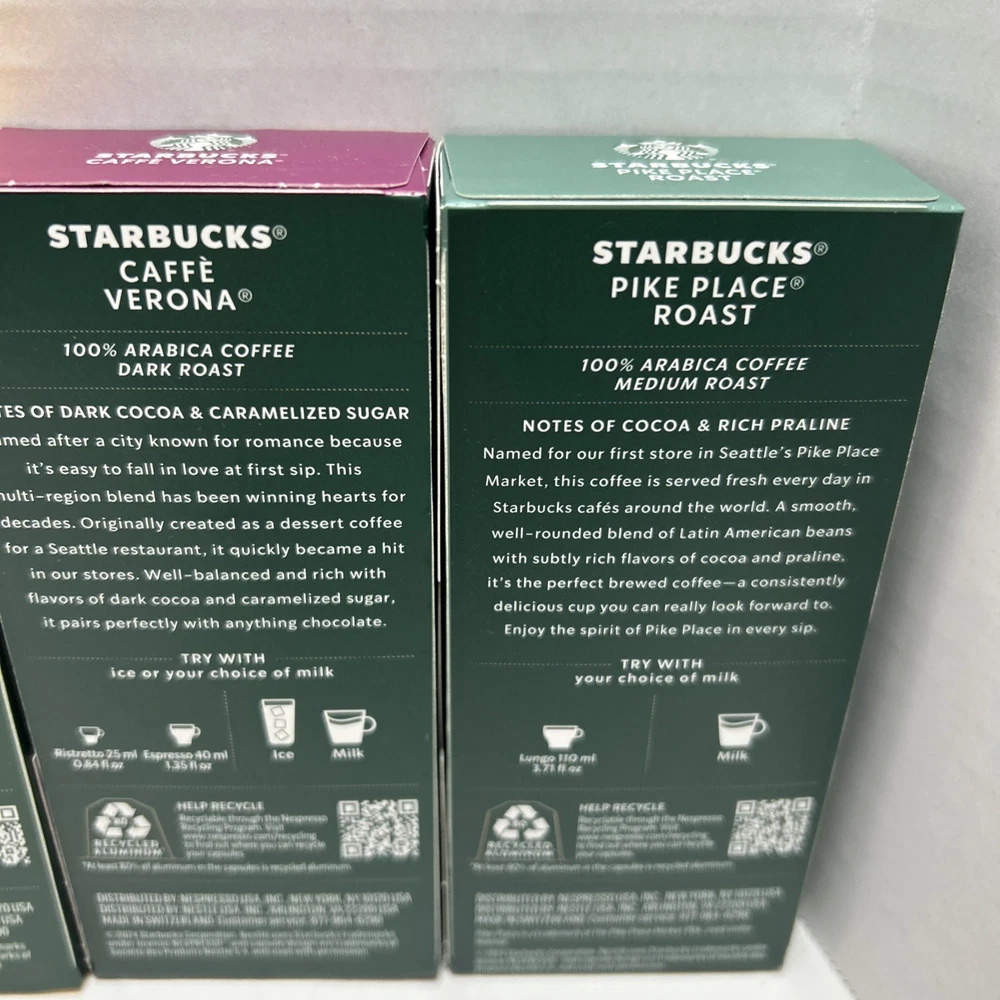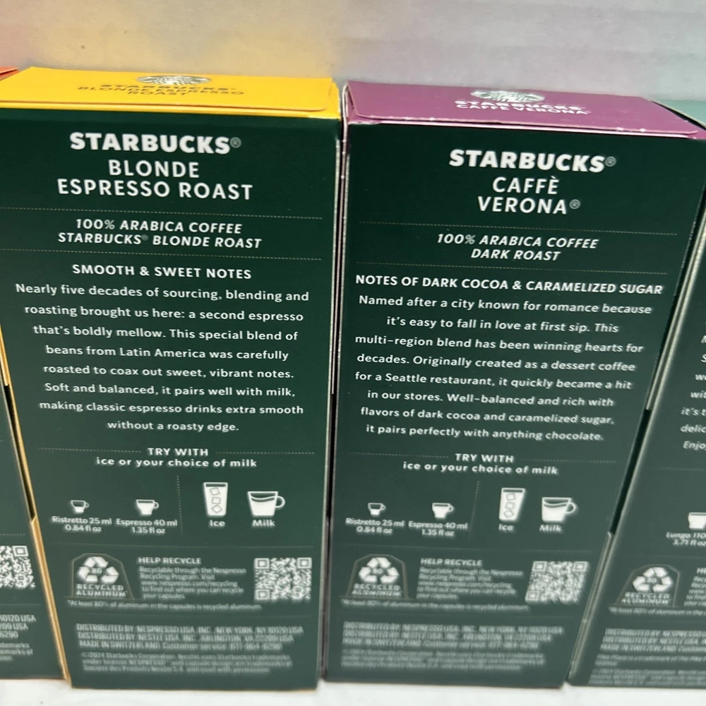 Indulge in the variety and convenience of Starbucks Nespresso Flavored Coffee with this 50 count pack of capsules. Enjoy a range of delicious flavors from the comfort of your own home with these espresso pods. With a serving size of 1 cup and less than 50 calories per serving, these Nespresso capsules offer a tasty and guilt-free option for breakfast or throughout the day. Compatible with Nespresso machines and free from fat, gluten, and dairy, this product ensures a satisfying dining experience. Flavors are: Blonde Expresso Roast, Pike Place Roast, Caffe Verona Ristretto, Single Origin Columbia and House Blend Lungo!