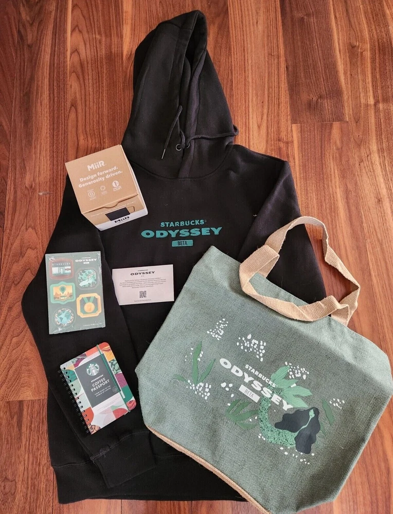 Starbucks VERY Limited Edition Odyssey "Beta" Merchandise Pack includes: Starbucks Odyssey branded hoodie in MEDIUM size - "Starbucks Odyssey Beta" inscription Starbucks Odyssey 12oz MiiR Camp Cup - "Starbucks Odyssey Beta" inscription Starbucks Odyssey tote bag Starbucks Odyssey sticker pack Starbucks coffee passport Everything is new in the original Starbucks Odyssey cardboard box it was shipped in. I opened the box solely to display & photograph the items: nothing has been worn or used. Condition: 100% NEW & AUTHENTIC