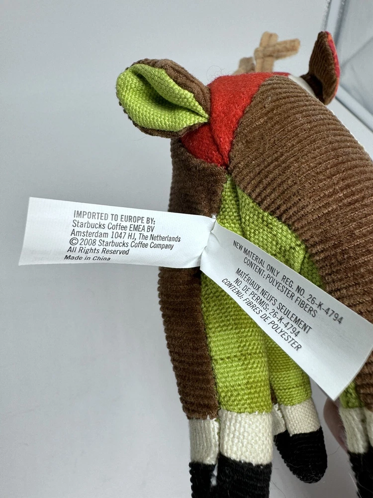 Add some festive cheer to your collection with this Starbucks Patchwork Reindeer plush toy. With its colorful patchwork design and cheerful expression, this 8-inch stuffed animal is perfect for both teens and adults. The reindeer features a multicolor finish and is part of the Animals collection, making it a great addition to any holiday or seasonal display. This original Starbucks plush toy was manufactured in 2008 and is in excellent condition, ready to be shipped to its new owner. The item length is 6.25 inches and the item height is 8 inches. Perfect for collectors of holiday and seasonal figurines, this reindeer is sure to bring a touch of animation to your home.