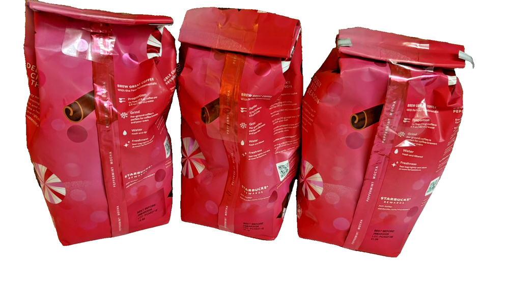 3 New bags PEPPERMINT MOCHA FLAVORED COFFEE: Deliciously crafted for the season—peppermint and mocha swirl together in this festive, flavored coffee that's a must-have for the holidays CAFÉ QUALITY: Starbucks is dedicated to delivering premium coffee—shipping you the same carefully roasted 100% arabica coffee beans brewed in the cafés JOYS OF THE HOLIDAY: Experience the joy of limited-edition holiday coffees, like Starbucks Peppermint Mocha Flavored Coffee, Starbucks Holiday Blend or new Starbucks Hazelnut Cocoa Flavored Coffee THE PERFECT PAIR: Starbucks Peppermint Mocha flavored coffee pairs perfectly with Starbucks Peppermint Mocha Creamer or your favorite Starbucks creamer for a delicious, comforting cup LIMITED-TIME EXCLUSIVE: Like the season itself, this limited-edition holiday coffee won't be around for long, so be sure to explore all the seasonal coffee offerings from Starbucks before they're gone