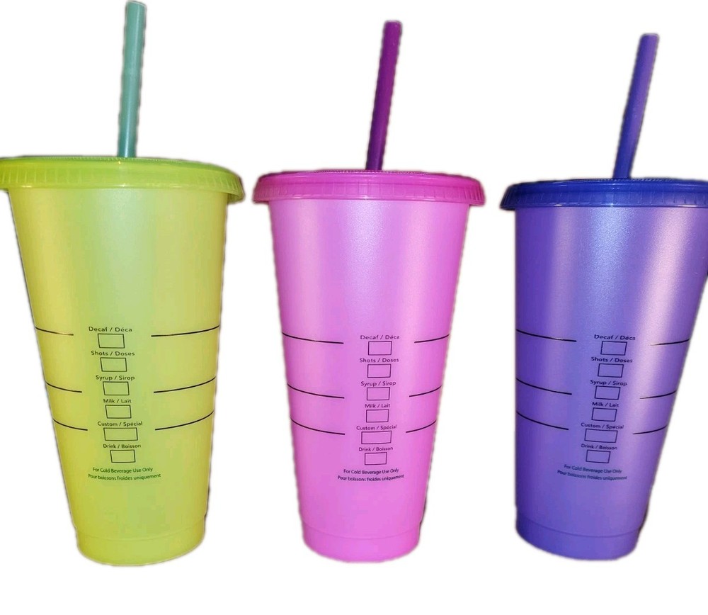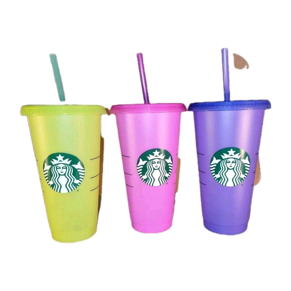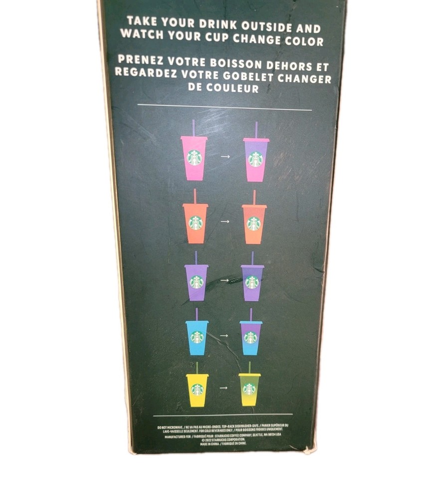 THESE ARE NEW. BOX INCLUDED. BOX HAS SOME DAMAGE. 2 CUPS WERE MISSING SO THERE ARE ONLY 3. The Starbucks Reusable Color Changing Cold Cups are a unique set of 3 pieces that are branded by the popular coffee chain. These cups can change color when filled with cold beverages, adding an exciting element to the drinking experience. With a colorful multi-color design and a theme focused on coffee & tea, these cups are a fun and eye-catching collectible item for Starbucks fans. Made in China in 2022, these cups are an original advertising piece for the brand. Perfect for both collectors and coffee enthusiasts, these cups are a must-have addition to any Starbucks memorabilia collection.