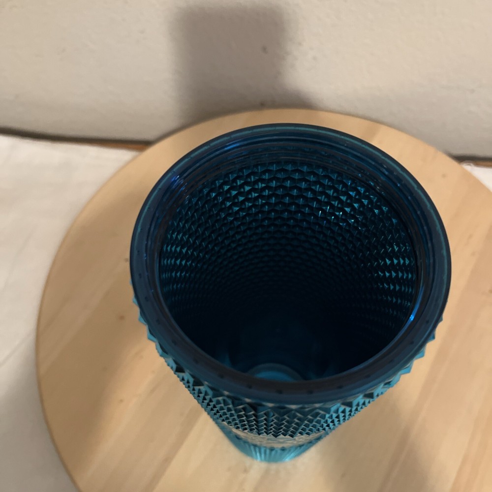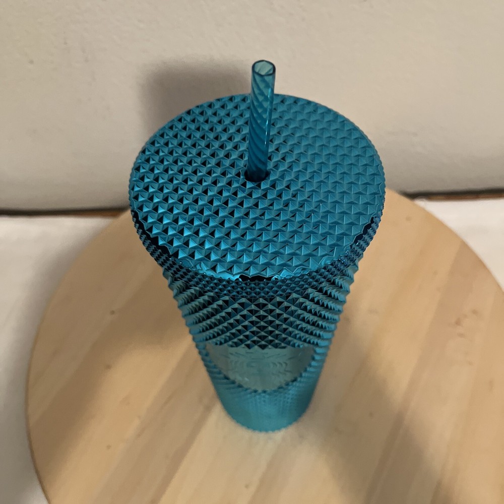 The product is a Starbucks Summer 2023 Metallic Chrome Teal Blue Bling Studded 24 oz Tumbler. It features a shiny metallic chrome teal blue design adorned with decorative studs for a stylish and eye-catching appearance. The tumbler is genuine Starbucks merchandise, brand new with the original price tag attached, confirming its authenticity as a Starbucks product. This collectible item is a unique piece from Starbucks, perfect for coffee and tea enthusiasts looking for a trendy and high-quality tumbler for their beverages.