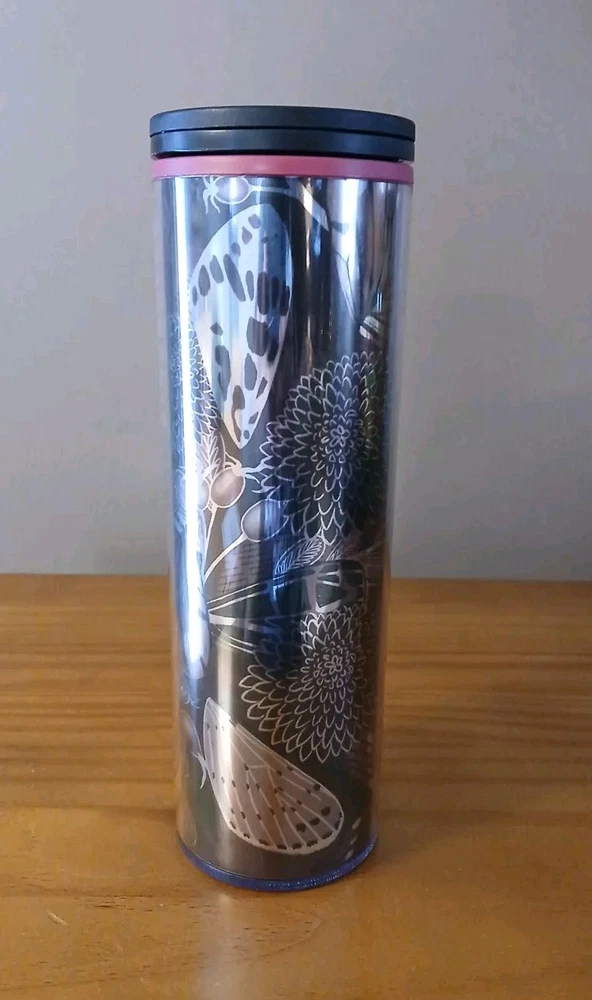 This is a 16 oz Starbucks Travel Tumbler made of acrylic, featuring a Black and Silver Metallic Butterfly design. It is a Limited Edition 2019 item with a coffee & Tea theme. The tumbler is an original creation from Starbucks, not modified, and was manufactured in China. This is an estate sale find, looks unused with paperwork inside the tumbler.