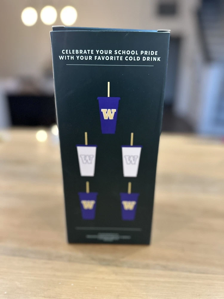 Show your love for the University of Washington Huskies with these Starbucks cold cups! These 24 oz cups come in a pack of 5 and feature the iconic purple color and logo of the Huskies. Perfect for coffee or tea lovers, these cups are made of recyclable material and are original Starbucks merchandise. These cups are perfect for collectors and fans alike, and are a great addition to any Starbucks or college-themed collection. Made in China, these cups are brand new in their original packaging and include straws. Get your hands on these Starbucks University of Washington Huskies cold cups today!