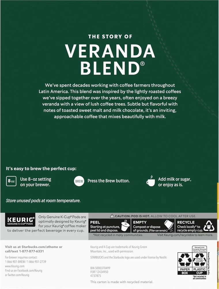 HOME Feedback Save Seller Newsletter Contact us Starbucks Veranda Blonde Roast K-Cup Pods 96ct Light Smooth Keurig Coffee Description 12.0 inches x 8.0 inches x 7.95 inches. Weight: 2.53 lb Item model number SBK011067986CT Roast Level Light Roast Product Dimensions 8 x 12 x 7.95 inches; 2.53 Pounds Caffeine Content Description Decaffeinated Flavor Name Veranda Flavor Veranda Manufacturer Coffee Item Form Capsule Size 24 Count (Pack of 4) PREMIUM COFFEE IN KEURIG K-CUPS—Starbucks blonde roast coffee K-Cups deliver exceptional coffee cup after cup with Veranda Blend lightly roasted coffee—96 total coffee pods for Keurig coffee makers STARBUCKS VERANDA BLEND COFFEE—Our lightest roasted coffee with notes of toasted malt and baking chocolate FRESH TASTE—Starbucks adheres to the highest quality standards—shipping you the same carefully roasted 100% arabica coffee beans we brew in our cafés MAKE IT YOUR OWN—Whether you like black coffee or adding personal touches of inspiration, like milk, cream, syrup or a variety of other additions, Starbucks is the perfect everyday coffee you can make your own ETHICALLY SOURCED—Starbucks is committed to 100% ethical coffee sourcing in partnership with Conservation International We’ve spent decades working with coffee farmers throughout Latin America. This blend was inspired by the lightly roasted coffees we’ve sipped together over the years, often enjoyed on a breezy veranda with a view of lush coffee trees. Subtle but flavorful with notes of toasted sweet malt and milk chocolate, it’s an inviting, approachable coffee that mixes beautifully with milk. Nestlé uses Starbucks trademarks under license. Payment PayPal is our preferred method of payment. If you do not have a PayPal account, all major credit cards are gladly accepted through PayPal as the payment processor. PayPal offers great buyer and seller protection. Your order will be processed pending receipt of cleared payment through PayPal. Sales tax may be charged depending on your location. Shipping We provide Free and Fast shipping. Most items are shipped within 3 business days of receiving cleared payment. We ship to the lower 48 contiguous United States only. We do not ship to P.O. boxes or APOs. We are always working hard to ensure your package arrives as soon as possible. Please understand that some factors like weather, high postal traffic, and the performance of shipping companies are outside of our control. (We ship the product from multiple warehouses). Returns We offer a 30-day return/exchange policy for most of our products. You can request a refund if you are dissatisfied for any reason with your product. (Restocking Fee May Apply). Only factory defects are accepted as a reason for a return. In the case of factory defects, if available, we will replace the product for you. When returning an item, it must be in all of the original packaging and include all of the original accessories or items that came with it. The item and package should be in original and perfect condition. All returns MUST be done within 30 days of the date of purchase. Please note that we cannot give refunds or replacements after the 30-day limit has expired. We are extremely fair, and in the rare event of something out of the ordinary happening with our products or shipping, we will gladly work with you to find a fair resolution. Feedback Feedback on eBay is a very important part of our Business as it is the feedback that we receive from our customer which shows any potential new customer that we are a trusted, friendly, efficient and proactive company. If for any reason you are not happy with your experience with salma-antique contact us and there is not issue large or small that we cannot try and resolve. We are all human and can make a mistake but it is how you fix that mistake that counts. Please give us that chance to sort it out before leaving a negative feedback. If you do not contact us about any issues you have we cannot resolve it. Please leave us positive feedback and all "5's" on the DSR, if you are happy with our service and product as this is what improves all Ebay sellers to provide the experience that all buyers want. Contact Us Click here to Contact Us