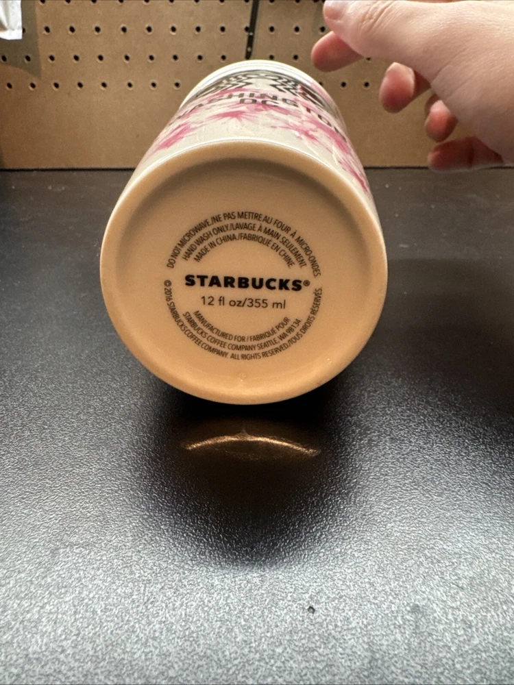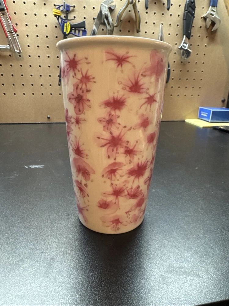 The product is a Starbucks Washington DC Cherry Blossom Ceramic Tumbler, holding 12 fl oz of liquid with a lid. It features a pink cherry blossom design, making it a unique and visually appealing collectible item. The tumbler is an original piece from Starbucks, manufactured in China, and is part of their coffee and tea-themed advertising. Perfect for coffee or tea lovers, this tumbler showcases a beautiful design inspired by the iconic cherry blossoms of Washington DC.